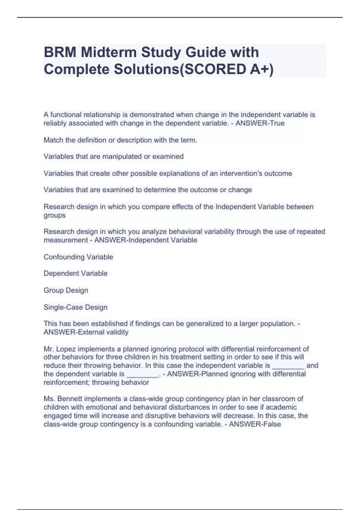 A functional relationship is demonstrated when change in the independent variable is reliably associated with change in the dependent variable. - ANSWER-True Match the definition or description with the term. Variables that are manipulated or examined Variables that create other possible explanations of an intervention's outcome Variables that are examined to determine the outcome or change Research design in which you compare effects of the Independent Variable between groups Research design in which you analyze behavioral variability through the use of repeated measurement - ANSWER-Independent Variable Confounding Variable Dependent Variable Group Design Single-Case Design This has been established if findings can be generalized to a larger population. - ANSWER-External validity Mr. Lopez implements a planned ignoring protocol with differential reinforcement of other behaviors for three children in his treatment setting in order to see if this will