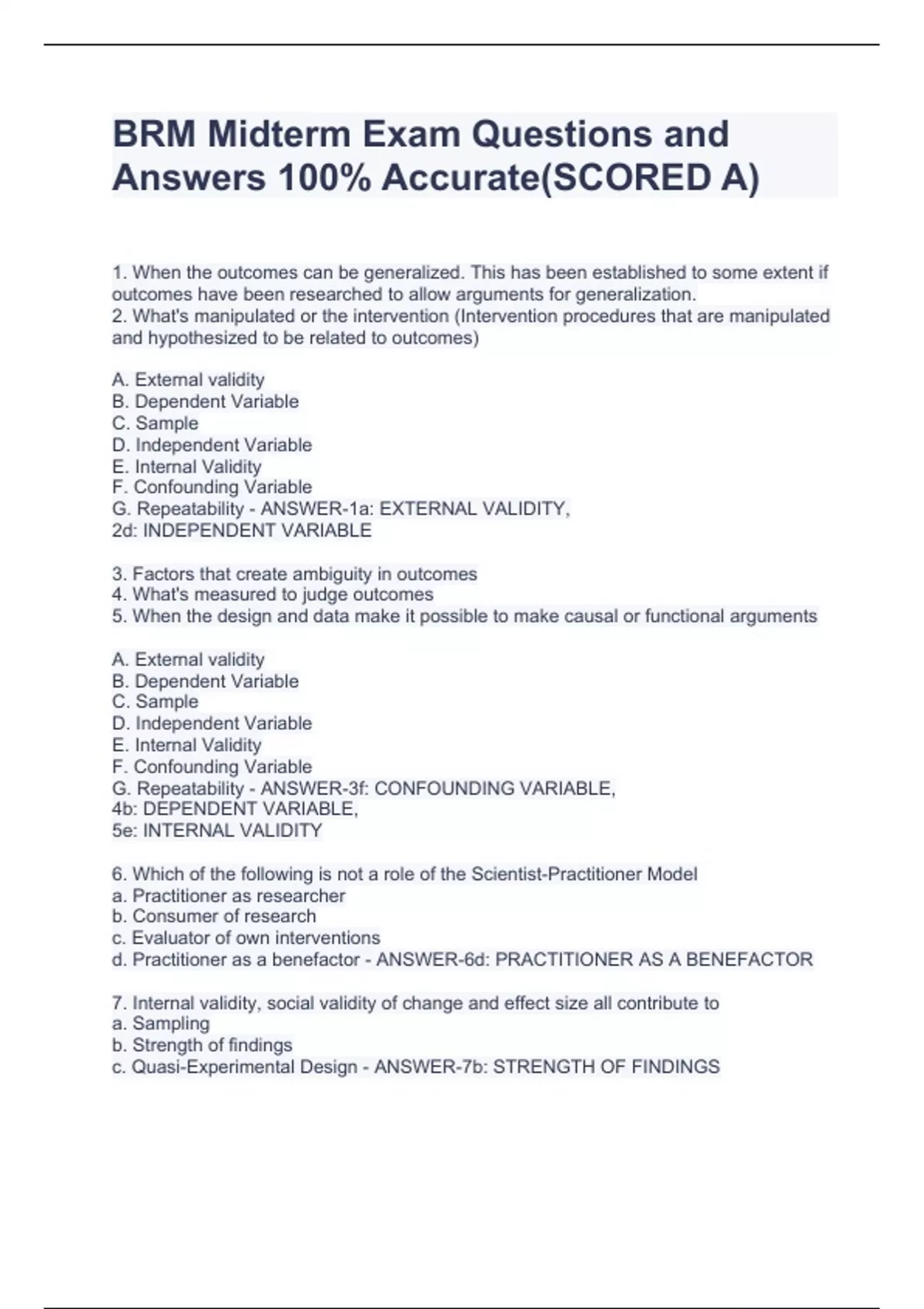 1. When the outcomes can be generalized. This has been established to some extent if outcomes have been researched to allow arguments for generalization. 2. What's manipulated or the intervention (Intervention procedures that are manipulated and hypothesized to be related to outcomes) A. External validity B. Dependent Variable C. Sample D. Independent Variable E. Internal Validity F. Confounding Variable G. Repeatability - ANSWER-1a: EXTERNAL VALIDITY, 2d: INDEPENDENT VARIABLE 3. Factors that create ambiguity in outcomes 4. What's measured to judge outcomes 5. When the design and data make it possible to make causal or functional arguments A. External validity B. Dependent Variable C. Sample D. Independent Variable E. Internal Validity F. Confounding Variable G. Repeatability - ANSWER-3f: CONFOUNDING VARIABLE, 4b: DEPENDENT VARIABLE, 5e: INTERNAL VALIDITY 6. Which of the following is not a role of the Scientist-Practitioner Model a. Practitioner as researcher b. Consumer of research