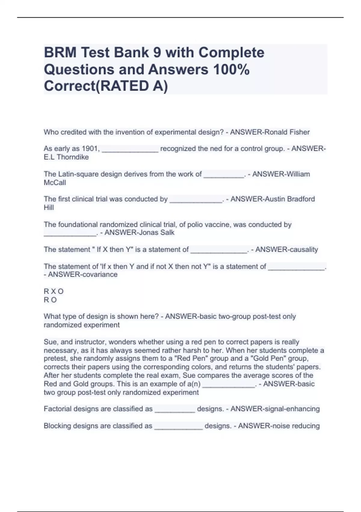 Who credited with the invention of experimental design? - ANSWER-Ronald Fisher As early as 1901, ______________ recognized the ned for a control group. - ANSWER-E.L Thorndike The Latin-square design derives from the work of __________. - ANSWER-William McCall The first clinical trial was conducted by _____________. - ANSWER-Austin Bradford Hill The foundational randomized clinical trial, of polio vaccine, was conducted by _____________. - ANSWER-Jonas Salk The statement " If X then Y" is a statement of ______________. - ANSWER-causality The statement of 'If x then Y and if not X then not Y" is a statement of ______________. - ANSWER-covariance R X O R O What type of design is shown here? - ANSWER-basic two-group post-test only randomized experiment Sue, and instructor, wonders whether using a red pen to correct papers is really necessary, as it has always seemed rather harsh to her. When her students complete a pretest, she randomly assigns them to a "Red Pen" group and a "Gold Pen" group, corrects their papers using the corresponding colors, and returns the students' papers.