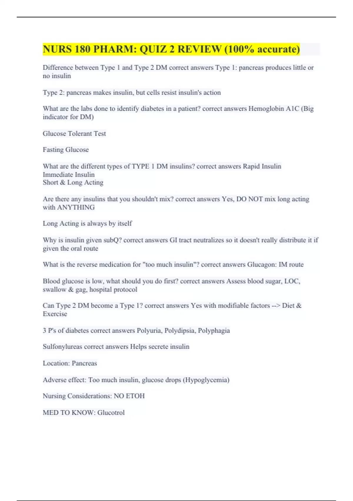 Difference between Type 1 and Type 2 DM correct answers Type 1: pancreas produces little or no insulin Type 2: pancreas makes insulin, but cells resist insulin's action What are the labs done to identify diabetes in a patient? correct answers Hemoglobin A1C (Big indicator for DM) Glucose Tolerant Test Fasting Glucose What are the different types of TYPE 1 DM insulins? correct answers Rapid Insulin Immediate Insulin Short & Long Acting Are there any insulins that you shouldn't mix? correct answers Yes, DO NOT mix long acting with ANYTHING Long Acting is always by itself Why is insulin given subQ? correct answers GI tract neutralizes so it doesn't really distribute it if given the oral route What is the reverse medication for "too much insulin"? correct answers Glucagon: IM route Blood glucose is low, what should you do first? correct answers Assess blood sugar, LOC, swallow & gag, hospital protocol Can Type 2 DM become a Type 1? correct answers Yes with modifiable factors --> Diet & Exercise 3 P's of diabetes correct answers Polyuria, Polydipsia, Polyphagia Sulfonylureas correct answers Helps secrete insulin Location: Pancreas Adverse effect: Too much insulin, glucose drops (Hypoglycemia) Nursing Considerations: NO ETOH MED TO KNOW: Glucotrol