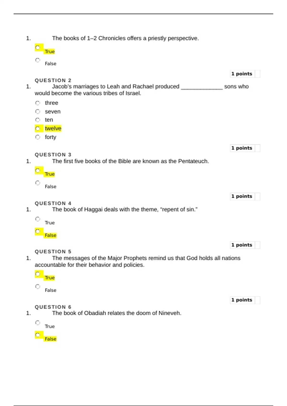 The books of 1–2 Chronicles offers a priestly perspective. True False 1 points QUESTION 2 1. Jacob’s marriages to Leah and Rachael produced _____________ sons who would become the various tribes of Israel. three seven ten twelve forty 1 points QUESTION 3 1. The first five books of the Bible are known as the Pentateuch. True False 1 points QUESTION 4 1. The book of Haggai deals with the theme, “repent of sin.” True False 1 points QUESTION 5 1. The messages of the Major Prophets remind us that God holds all nations accountable for their behavior and policies. True False 1 points QUESTION 6 1. The book of Obadiah relates the doom of Nineveh. T