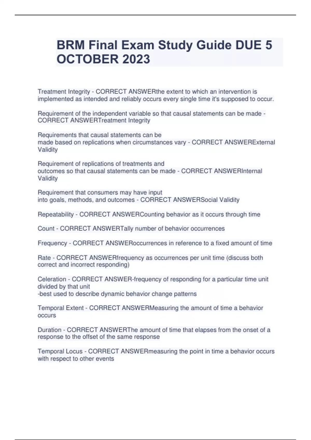 BRM Final Exam Study Guide DUE 5 OCTOBER 2023 Treatment Integrity - CORRECT ANSWERthe extent to which an intervention is implemented as intended and reliably occurs every single time it's supposed to occur. Requirement of the independent variable so that causal statements can be made - CORRECT ANSWERTreatment Integrity Requirements that causal statements can be made based on replications when circumstances vary - CORRECT ANSWERExternal Validity Requirement of replications of treatments and outcomes so that causal statements can be made - CORRECT ANSWERInternal Validity Requirement that consumers may have input into goals, methods, and outcomes - CORRECT ANSWERSocial Validity Repeatability - CORRECT ANSWERCounting behavior as it occurs through time Count - CORRECT ANSWERTally number of behavior occurrences Frequency - CORRECT ANSWERoccurrences in reference to a fixed amount of time Rate - CORRECT ANSWERfrequency as occurrences per unit time (discuss both correct and incorrect responding) Celeration - CORRECT ANSWER-frequency of responding for a particular time unit divided by that unit -best used to describe dynamic behavior change patterns Temporal Extent - CORRECT ANSWERMeasuring the amount of time a behavior occurs Duration - CORRECT ANSWERThe amount of time that elapses from the onset of a response to the offset of the same response Temporal Locus - CORRECT ANSWERmeasuring the point in time a behavior occurs with respect to other events Response Latency - CORRECT ANSWERThe amount of time between some relevant stimulus and the response Interresponse Time (IRT) - CORRECT ANSWERThe amount of time between two responses Trials to Criterion - CORRECT ANSWERThe number of times the person needs the opportunity to engage in a behavior in order to reach some type of criterion. Magnitude/Intensity - CORRECT ANSWERforce/strength of the response Permanent Products - CORRECT ANSWERThe actual physical, tangible things left in environment after behavior occurs Direct Observation - CORRECT ANSWER-a measurement system that takes data at the time/place the behavior occurs (watching behavior as it occurs) -considered gold standard of measuring behaviors Event Recording - CORRECT ANSWERrecord the number of occurrences of a behavior Permanent Product Recording - CORRECT ANSWERevents of interest are recorded at the end of a period of time or after some task is completed Duration Recording - CORRECT ANSWERThe most direct measure; documents amount of time that elapses between the onset of an event and the end of the same event Latency Recording - CORRECT ANSWERthe time between the onset of a stimulus/behavior and the subsequence onset of the target responses is recorded. Time Sampling - CORRECT ANSWERdivide observation interval into very small intervals of time and record whether or not the behavior occurs or does not occur during each specific interval Whole Interval Recording - CORRECT ANSWER-behavior must occur for entire interval in order for it to be scored as occurring during that interval -typically only used when behavior has long duration Partial Interval Recording - CORRECT ANSWERbehavior has to occur at a certain time or for a certain time during the interval Momentary Time Sampling - CORRECT ANSWERat the end of each interval we record whether the behavior is occurring or not Momentary Interval Recording - CORRECT ANSWERonly a part of the entire interval is observed
