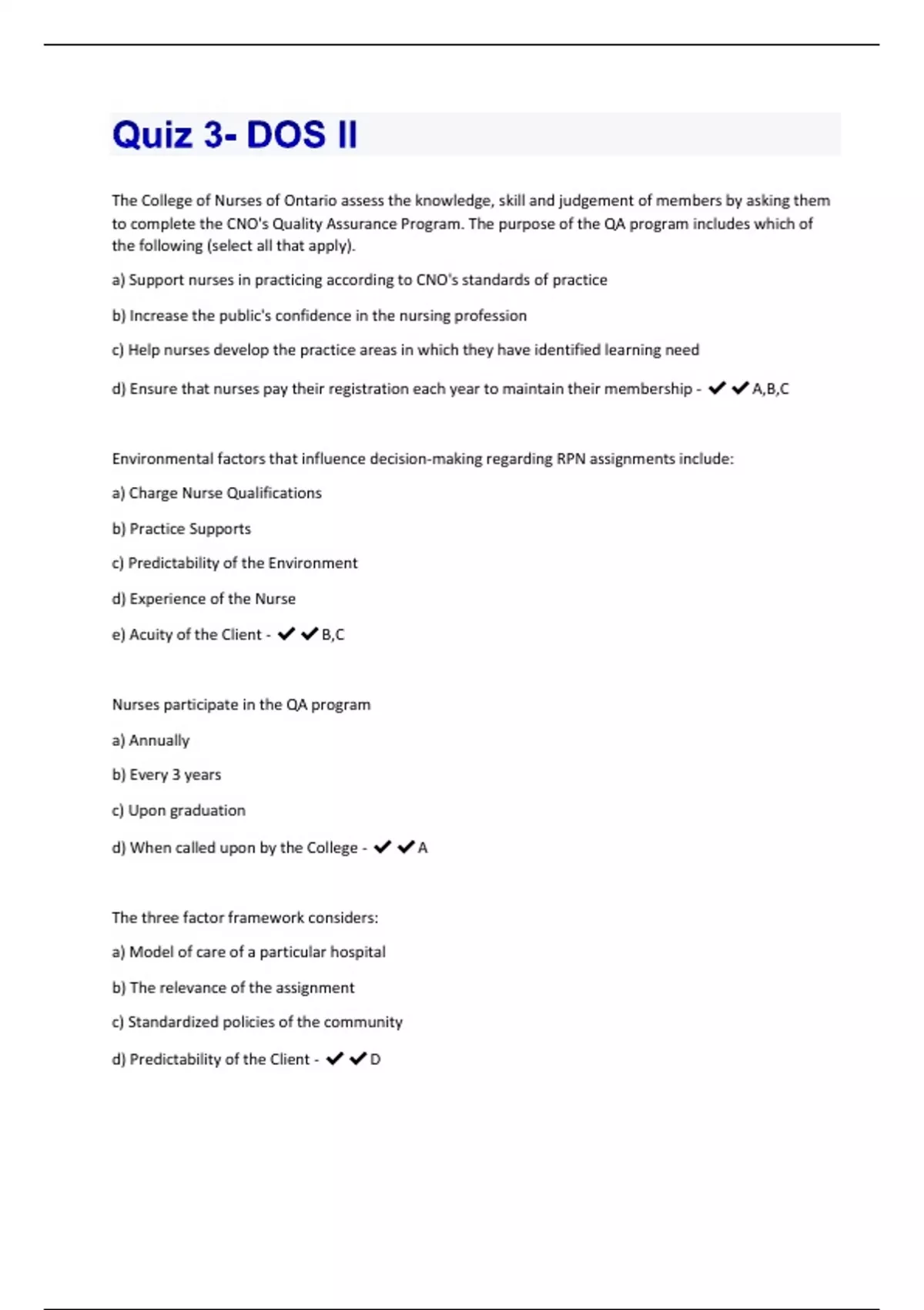The College of Nurses of Ontario assess the knowledge, skill and judgement of members by asking them to complete the CNO's Quality Assurance Program. The purpose of the QA program includes which of the following (select all that apply). a) Support nurses in practicing according to CNO's standards of practice b) Increase the public's confidence in the nursing profession c) Help nurses develop the practice areas in which they have identified learning need d) Ensure that nurses pay their registration each year to maintain their membership - A,B,C Environmental factors that influence decision-making regarding RPN assignments include: a) Charge Nurse Qualifications b) Practice Supports c) Predictability of the Environment d) Experience of the Nurse e) Acuity of the Client - B,C Nurses participate in the QA program a) Annually b) Every 3 years c) Upon graduation d) When called upon by the College - A The three factor framework considers: a) Model of care of a particular hospital b) The relevance of the assignment c) Standardized policies of the community d) Predictability of the Client - DThe Quality Assurance Program includes all except: a) Practice Reflection b) Learning Goals c) Exam d) Learning Plan - C Lucy is a RPN working on a medical unit. She is the Charge Nurse today and is formulating the assignments for the evening shift. Lucy knows she must consider the 3 factor framework when deciding Nursing assessment. Which of the following should she recognize? a) Environment is the most important factor in the 3 factor framework b) RPNs are expected to meet a wide range of nursing care needs for complex and unpredictable patients c) When consulting with a RN impacts the RPNs ability to provide efficient and appropriate care, then care should be transferred to the RN d) RPNs may autonomously care for clients for whom signs and symptoms of complications may be subtle - C How many learning goals are nurses in the General Class (RNs & RPNs) required to develop and achieve each year? a) 2 b) 3 c) 5 d) 1 - A