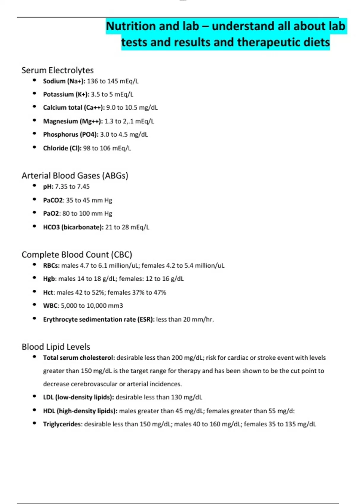 Summary Nutrition and lab – understand all about lab tests and results and therapeutic diets