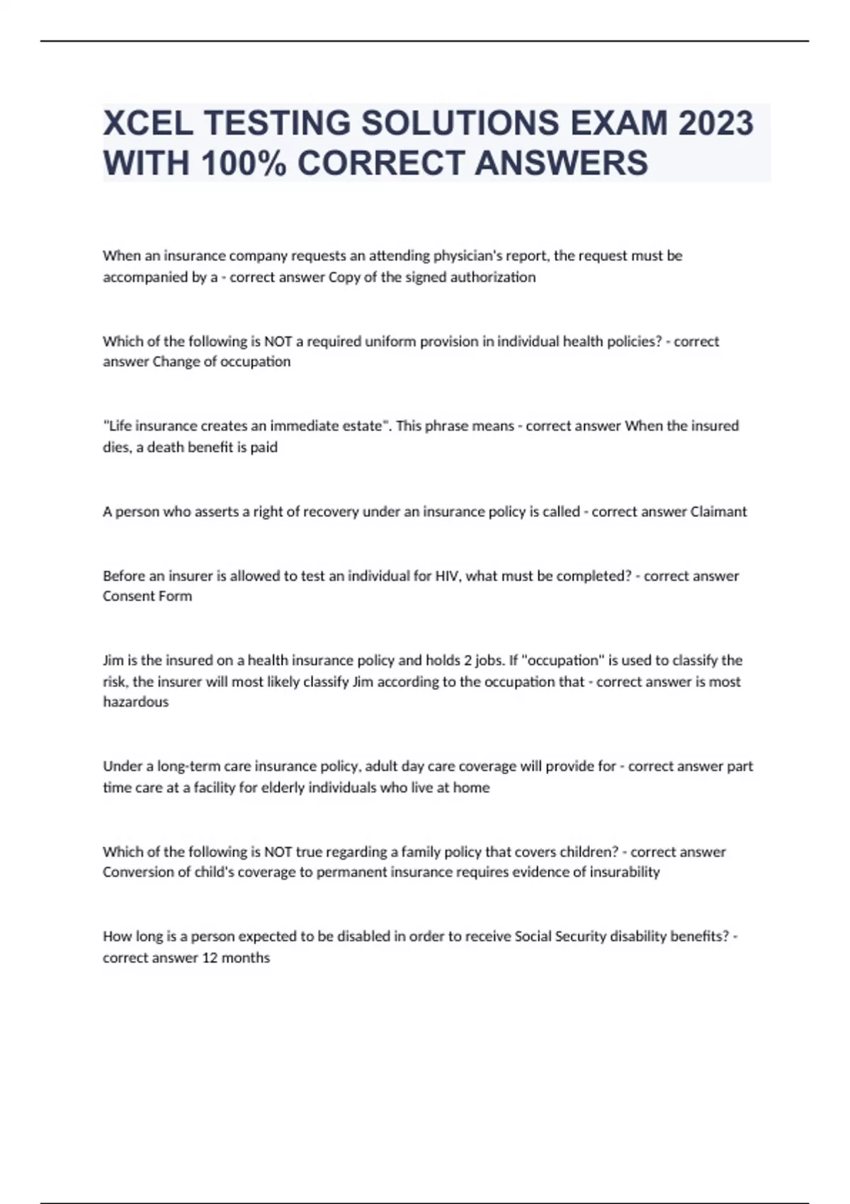 When an insurance company requests an attending physician's report, the request must be accompanied by a - correct answer Copy of the signed authorization Which of the following is NOT a required uniform provision in individual health policies? - correct answer Change of occupation "Life insurance creates an immediate estate". This phrase means - correct answer When the insured dies, a death benefit is paid A person who asserts a right of recovery under an insurance policy is called - correct answer Claimant Before an insurer is allowed to test an individual for HIV, what must be completed? - correct answer Consent Form Jim is the insured on a health insurance policy and holds 2 jobs. If "occupation" is used to classify the risk, the insurer will most likely classify Jim according to the occupation that - correct answer is most hazardous Under a long-term care insurance policy, adult day care coverage will provide for - correct answer part time care at a facility for elderly individuals who live at home Which of the following is NOT true regarding a family policy that covers children? - correct answer Conversion of child's coverage to permanent insurance requires evidence of insurability How long is a person expected to be disabled in order to receive Social Security disability benefits? - correct answer 12 months Which of the following describes the number of deaths in a year compared to the number of people in a select group? - correct answer Mortality rate Which of the following is NOT required in the content of a policy? - correct answer Probability of loss