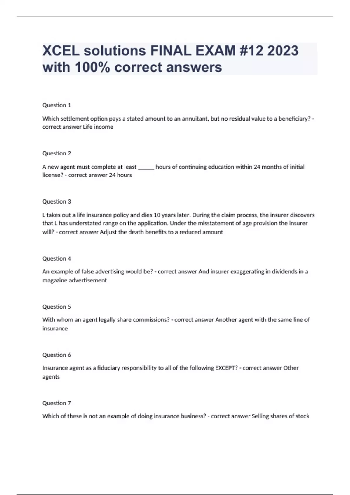 Question 1 Which settlement option pays a stated amount to an annuitant, but no residual value to a beneficiary? - correct answer Life income Question 2 A new agent must complete at least _____ hours of continuing education within 24 months of initial license? - correct answer 24 hours Question 3 L takes out a life insurance policy and dies 10 years later. During the claim process, the insurer discovers that L has understated range on the application. Under the misstatement of age provision the insurer will? - correct answer Adjust the death benefits to a reduced amount Question 4 An example of false advertising would be? - correct answer And insurer exaggerating in dividends in a magazine advertisement Question 5 With whom an agent legally share commissions? - correct answer Another agent with the same line of insurance Question 6 Insurance agent as a fiduciary responsibility to all of the following EXCEPT? - correct answer Other agents Question 7 Which of these is not an example of doing insurance business? - correct answer Selling shares of stock Question 8 taking receipt of premiums and holding them for the insurance company is an example of? - correct answer Fiduciary responsibility Question 9 How does an indexed annuity differ from a fixed annuity? - correct answer Indexed annuity owners receive crediting interest time to the fluctuation of the linked index Question 10 which of the following policies combines investment choices with a form of Term coverage? - correct answer Variable universal life Question 11 How long does an insurance company appointment remain in force? - correct answer Until terminated Question 12 in Texas an individual life insurance policy is REQUIRED to have a grace period of? - correct answer 31 days Question 13 Which statement