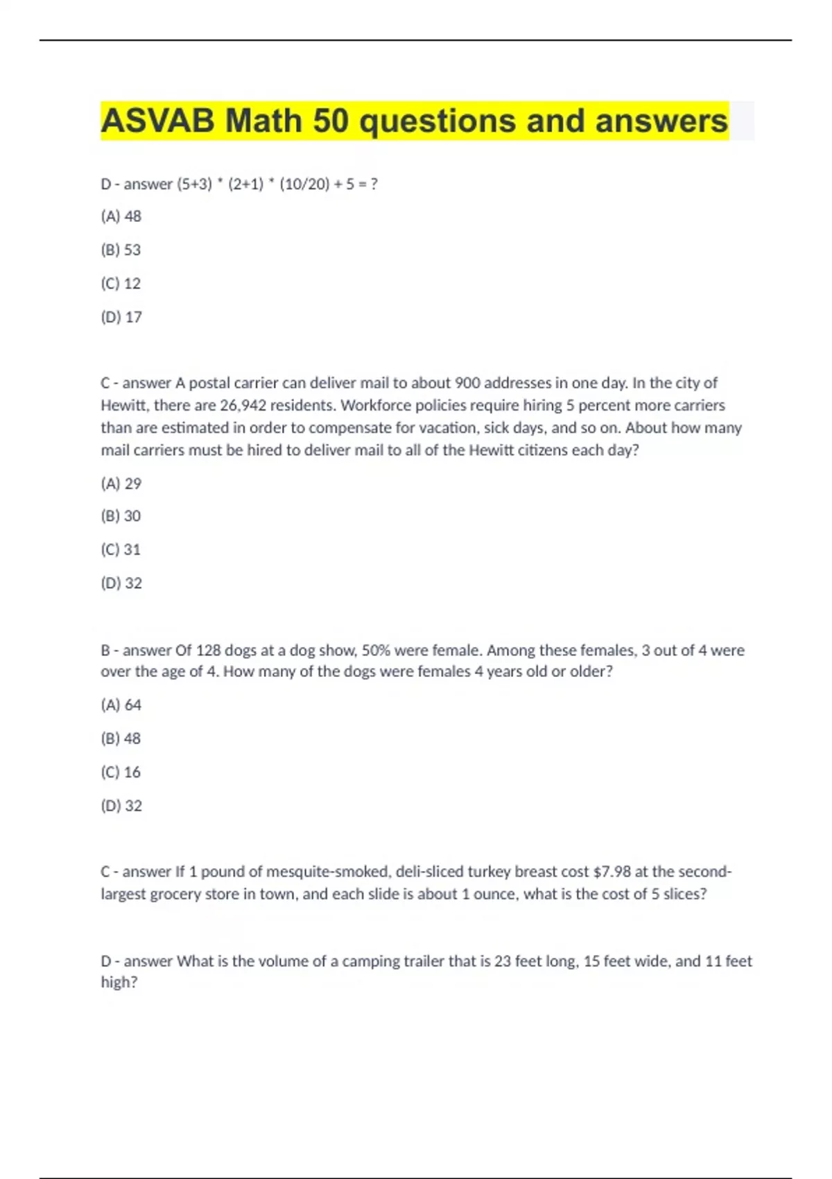 D (5+3) (2+1) (10/20) + 5 = ? (A) 48 (B) 53 (C) 12 (D) 17 C A postal carrier can deliver mail to about 900 addresses in one day. In the city of Hewitt, there are 26,942 residents. Workforce policies require hiring 5 percent more carriers than are estimated in order to compensate for vacation, sick days, and so on. About how many mail carriers must be hired to deliver mail to all of the Hewitt citizens each day? (A) 29 (B) 30 (C) 31 (D) 32 B Of 128 dogs at a dog show, 50% were female. Among these females, 3 out of 4 were over the age of 4. How many of the dogs were females 4 years old or older? (A) 64 (B) 48 (C) 16 (D) 32 C If 1 pound of mesquite-smoked, deli-sliced turkey breast cost $7.98 at the second-largest grocery store in town, and each slide is about 1 ounce, what is the cost of 5 slices? D What is the volume of a camping trailer that is 23 feet long, 15 feet wide, and 11 feet high? (A) 2,530 square feet (B) 2,950 cubic feet (C) 3,295 square feet (D) 3,795 cubic feet C Jonathan spent 4 hours studying, 1 hour raking leaves, 30 minutes doing laundry, and 2 hours watching TV. What percentage of his time was spent studying? (A) 46.6% (B) 50.0% (C) 53.3% (D) 57.1% D Which of these is an example of similar figures in the geometric sense? (A) A soccer ball and a football (B) A right triangle and an isosceles triangle (C) A bicycle and a tricycle (D) A sailing ship and a scale model of that ship B The fuel tank of a gasoline generator has enough capacity to operate the generator for an hour and 15 minutes. About how many times must the fuel tank be filled to run the generator from 6h15pm to 7h00am? (A) 9.4 (B) 10.2 (C) 10.8 (D) 11.5 B A private pilot needs to calculate how much fuel is needed for an upcoming trip of his vintage Waco biplane. The biplane's Jacobs B2M radial engine consumes about 15 gallons per hour at the aircraft's cruising speed of 120mph, and about 18 gallons per hour at speeds above 200mph. The plane will take off from Love Field General Aviation in Fort Worth, Texas, and fly 120 miles at cruising speed and then for 30 minutes near its top speed of 214mph. If the pilot must put in enough fuel for the trip plus an additional 5 gallons, how much fuel is needed? (A) 21.5 gallons (B) 29.0 gallons (C) 38.0 gallons (D) 48.5 gallons C During 1 season, a college football quarterback attempted 439 passes and completed 267 of them for a total of 3,217 yards. What is his completion percentage? (A) 13.6% (B) 54.2% (C) 60.8% (D) 62.8% B Jolie Marie has a 25-year term life insurance policy for $100,000. The annual premium is $15.00 per thousand. What is the total premium paid for this policy every 6 months? (A) $600 (B) $750 (C) $1,200 (D) $1,500 A Danny is comparing the prices of tuxedos for his prom. A rental tuxedo costs $70, while a new tuxedo costs $120. Danny is thinking about having to have a tuxedo for next year's prom as well. Keeping this in mind, how much money will Danny save if he uses the same suit two years in a row? Assume that he will have to pay $4.50 to dry clean it before next year's prom. (A) $15.50 (B) $20.00 (C) $20.50 (D) $35.00 C Amanda is working as a hostess at a local restaurant until she graduates from college. She receives an equal cut of a 10% tip share (calculated on total sales) split on an hourly basis between the hostesses and busboys. Amanda also receives her hourly wage of $3.13 an hour. The restaurant sale's were $7,874 for a 7-hour shift that 3 hostesses and 2 busboys all worked from open to close. How much tip share did the busboys receive together on their shift? (A) $157.48 (B) $179.39 (C) $314.96 (D) $472.44 D June found a chandelier for the dining room for $1,399. However, since the model has been discontinued and the display had no factory packaging material, the store manager discounted the price to $1,149. What was the percentage of the reduction? (A) 10.8% (B) 12.9% (C) 14.1% (D) 17.9% B Heather bought a rectangular Afghan rug with a perimeter that measures 36 feet. If the long sides measure 12 feet each, how long is each short side of the rug? (A) 4 feet (B) 6 feet (C) 10 feet (D) 12 feet C Jonathan wants to find the average number of miles traveled per day on his 3-day road trip. Since he is an engineer, he decides to set up the problem algebraically. If he drove A miles the first day, B miles the second day, and C miles the third day, what is the formula for the average number of miles driven per day? (A) 3abc (B) 3(a+b+c) (C) (a+b+c)/3 (D) (a+b+c)^3 C June found a pair of red heels regularly priced at $120. The ones she found were priced at $54, while all of the other boxes of the same shoes were sale priced at $67. Since June is going to buy this particular pair of shoes, she wants to calculate the extra amount that she saved compared to the correct sale price. What is the difference between her mispriced shoes and the sale price of the shoes? (A) 44.2% (B) 55.0% (C) 10.8% (D) 14.0% C Travis invests $5,000 at 4% annual interest. How much more must he invest at the same rate to insure that his annual income from both investments exceeds $700? (A) $9,750 (B) $10,000 (C) $12,500 (D) $14,750 A Although a total of 131 soldiers are authorized for an infantry company, B Company (Bulldogs), 3rd Battalion, 144th Infantry Regiment, has only 120 soldiers assigned, of whom 5% are officers. How many enlisted soldiers are assigned to the company? (A) 114 (B) 123 (C) 120 (D) 121 D A girls' softball team won 70% of the 40 games it played. How many games did it lose? (A) 28 (B) 30 (C) 22 (D) 12 B How many 4oz candy bars are there in a 3lb package of candy? (A) 9 (B) 12 (C) 16 (D) 24 B One section of the front lawn of the Walker family's house is 21 feet wide and 39 feet long. How much will it cost to weed and feed it if Ace Gardening Service charges $0.40 per square yard for this treatment? (A) $109.20 (B) $36.40 (C) $327.60 (D) $24.00 B What is the fifth term of the series 2 5/6, 3 1/2, 4 1/6, 4 5/6, ...? (A) 5 1/6 (B) 5 1/2 (C) 5 5/6 (D) 6 1/6 B