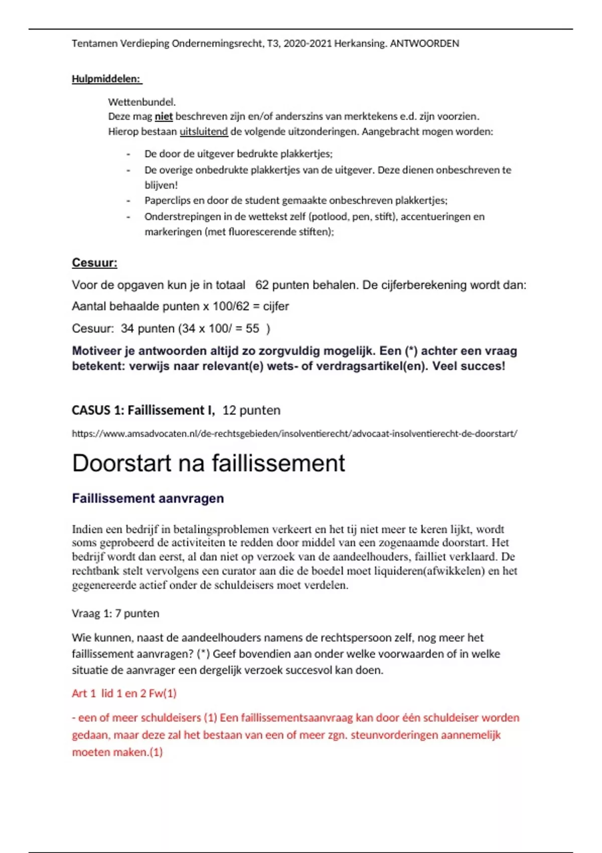 Tentamen Verdieping Ondernemingsrecht, T3, 2020-2021 Herkansing. ANTWOORDEN