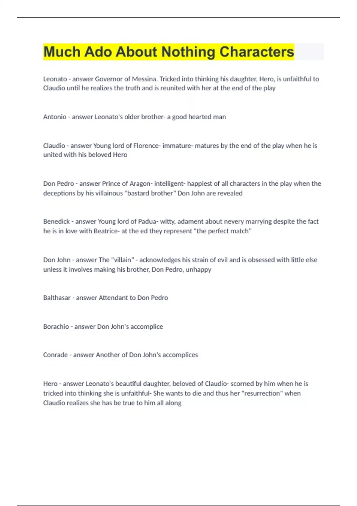 Leonato Governor of Messina. Tricked into thinking his daughter, Hero, is unfaithful to Claudio untl he realizes the truth and is reunited with her at the end of the play Antonio Leonato's older brother- a good hearted man Claudio Young lord of Florence- immature- matures by the end of the play when he is united with his beloved Hero Don Pedro Prince of Aragon- intelligent- happiest of all characters in the play when the deceptions by his villainous "bastard brother" Don John are revealed Benedick Young lord of Padua- witty, adament about nevery marrying despite the fact he is in love with Beatrice- at the ed they represent "the perfect match" Don John The "villain" - acknowledges his strain of evil and is obsessed with little else unless it involves making his brother, Don Pedro, unhappy Balthasar Attendant to Don Pedro Borachio Don John's accomplice Conrade Another of Don John's accomplices Hero Leonato's beautiful daughter, beloved of Claudio- scorned by him when he is tricked into thinking she is unfaithful- She wants to die and thus her "resurrection" when Claudio realizes she has be true to him all along Beatrice Vocal focus of the play- Wages a "merry war" with Benedick, sure that he loves her- she is right Margaret Hero's attendant- she is a flirt with Benedick, terrible gossip and makes love with Borachio- not a real villainess, just a simpleton Ursula Another attendant of Hero Dogberry Funny constable who fractures both logic and the English language- brings villains to justice, but by accident Verges Dogberry's bumbling assistant