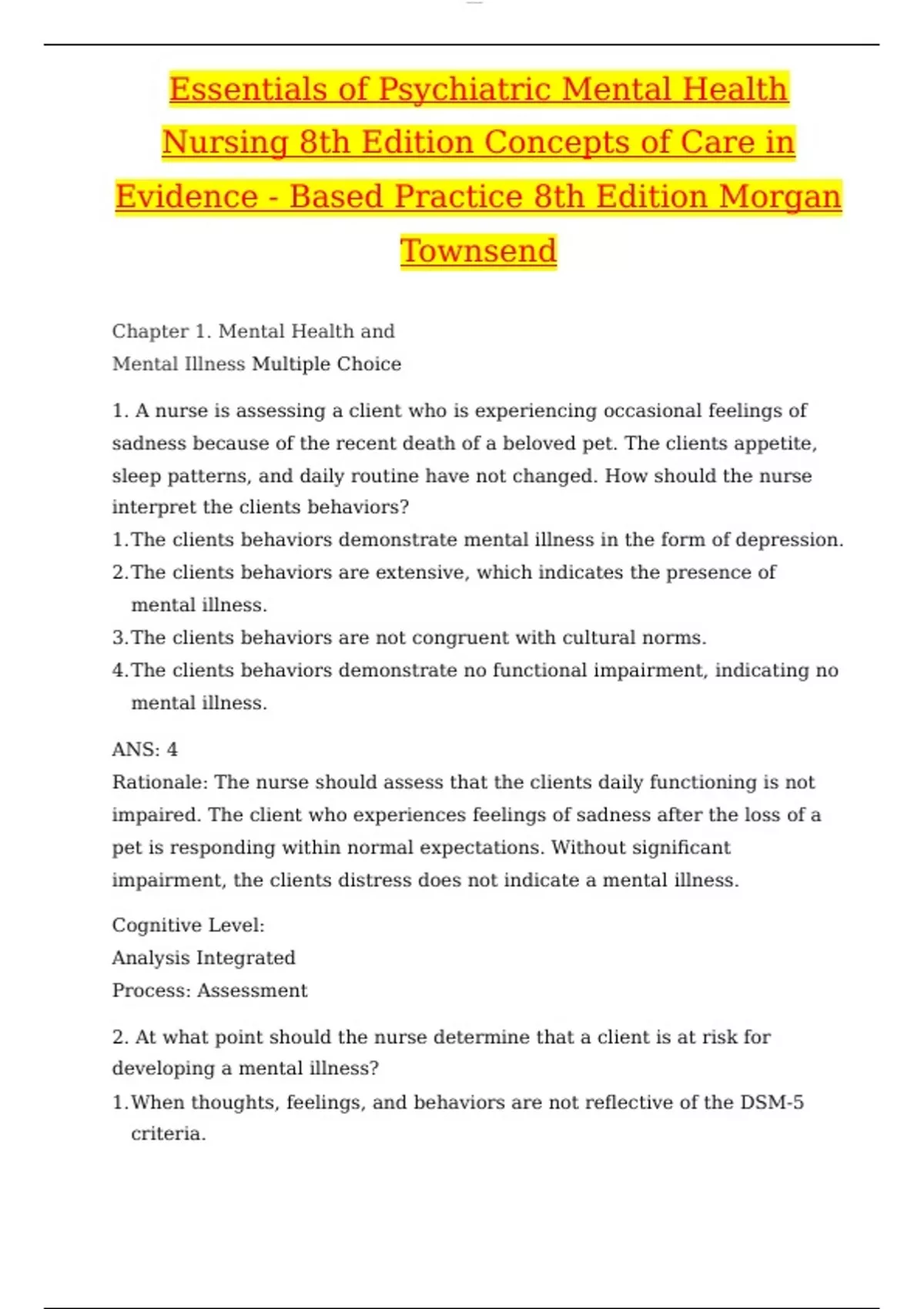 Chapter 1. Mental Health and Mental Illness Multiple Choice 1. A nurse is assessing a client who is experiencing occasional feelings of sadness because of the recent death of a beloved pet. The clients appetite, sleep patterns, and daily routine have not changed. How should the nurse interpret the clients behaviors? 1.The clients behaviors demonstrate mental illness in the form of depression. 2.The clients behaviors are extensive, which indicates the presence of mental illness. 3.The clients behaviors are not congruent with cultural norms. 4.The clients behaviors demonstrate no functional impairment, indicating no mental illness. ANS: 4 Rationale: The nurse should assess that the clients daily functioning is not impaired. The client who experiences feelings of sadness after the loss of a pet is responding within normal expectations. Without significant impairment, the clients distress does not indicate a mental illness. Cognitive Level: Analysis Integrated Process: Assessment 2. At what point should the nurse determine that a client is at risk for developing a mental illness? 1.When thoughts, feelings, and behaviors are not reflective of the DSM-5 criteria. lOMoARcPSD|7906827 2.When maladaptive responses to stress are coupled with interference in daily functioning. 3.When a client communicates significant distress. 4.When a client uses defense mechanisms as ego protection. ANS: 2 Rationale: The nurse should determine that the client is at risk for mental illness when responses to stress are maladaptive and interfere with daily functioning. The DSM-5 indicates that in order to be diagnosed with a mental illness, daily functioning must be significantly impaired. The clients ability to communicate distress would be considered a positive attribute. Cognitive Level: Application Integrated Process: Assessment 3. A nurse is assessing a set of 15-year-old identical twins who respond very differently to stress. One twin becomes anxious and irritable, and the other withdraws and cries. How should the nurse explain these different stress responses to the parents? 1.Reactions to stress are relative rather than absolute; individual responses to stress vary. 2.It is abnormal for identical twins to react differently to similar stressors. 3.Identical twins should share the same temperament and respond similarly to stress. 4.Environmental influences to stress weigh more heavily than genetic influences. lOMoARcPSD|7906827 ANS: 1 Rationale: The nurse should explain to the parents that, although the twins have identical DNA, there are several other factors that affect reactions to stress. Mental health is a state of being that is relative to the individual client. Environmental influences and temperament can affect stress reactions. Cognitive Level: Application Integrated Process: Implementation 4. Which client should the nurse anticipate to be most receptive to psychiatric