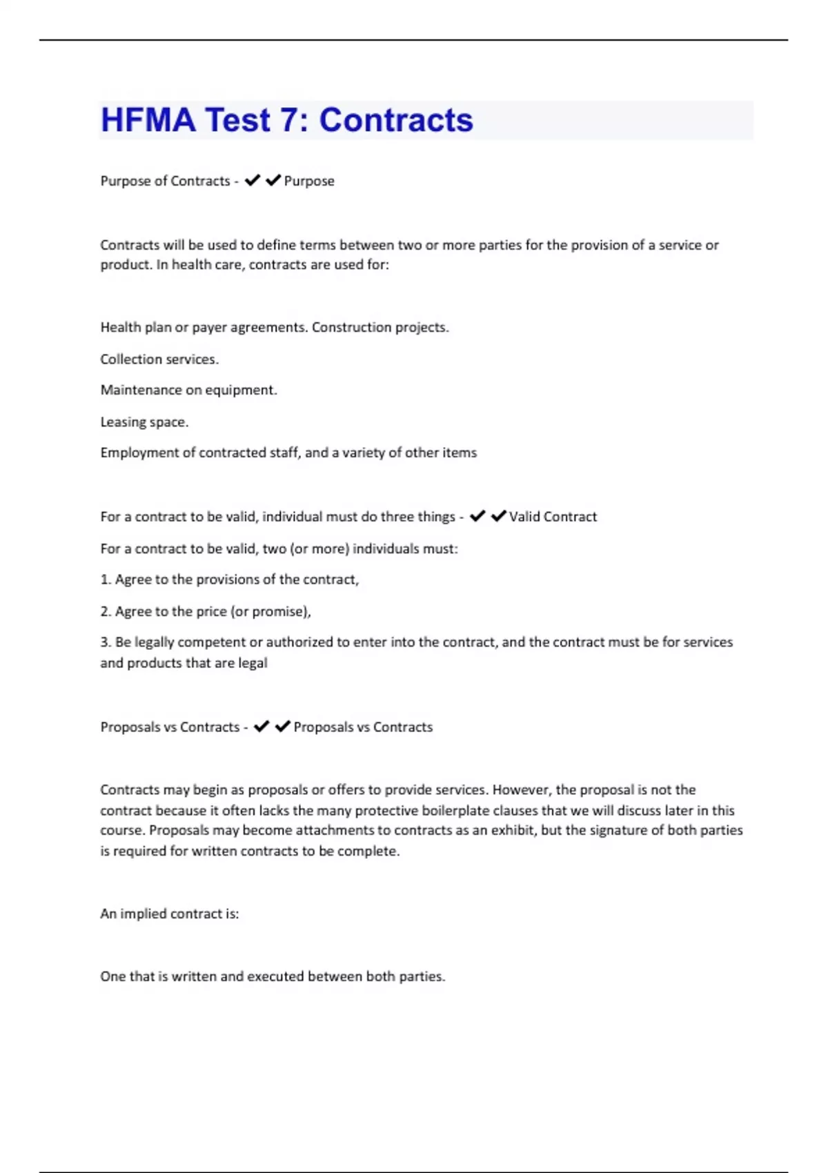 Purpose of Contracts - Purpose Contracts will be used to define terms between two or more parties for the provision of a service or product. In health care, contracts are used for: Health plan or payer agreements. Construction projects. Collection services. Maintenance on equipment. Leasing space. Employment of contracted staff, and a variety of other items For a contract to be valid, individual must do three things - Valid Contract For a contract to be valid, two (or more) individuals must: 1. Agree to the provisions of the contract, 2. Agree to the price (or promise), 3. Be legally competent or authorized to enter into the contract, and the contract must be for services and products that are legal Proposals vs Contracts -Proposals vs Contracts Contracts may begin as proposals or offers to provide services. However, the proposal is not the contract because it often lacks the many protective boilerplate clauses that we will discuss later in this course. Proposals may become attachments to contracts as an exhibit, but the signature of both parties is required for written contracts to be complete. An implied contract is: One that is written and executed between both parties.One where there has been a verbal exchange of provisions between both parties. One where the actions of the parties demonstrate willingness to the intent of the agreement. None of the above. - One where the actions of the parties demonstrate willingness to the intent of the agreement. Purpose of Boilerplate Provisions - Purpose The purpose of boilerplate provisions is to save the parties and drafters of contracts time through the use of language that is common in most contracts. Although the clause may be labeled as a boilerplate provision, it can still be tailored to meet your specific contracting requirements. Always read ALL sections of any contract before signing it. Examples of Boilerplate Provisions: - Examples of Boilerplate Provisions: 1. Choice of Law 2. Modification of Agreement 3. Severability of Agreement 4. Separate Exhibits 5. Survival 6. Confidentiality 7. Representation/Signatories 8. Notice 9. Entire Agreement 10. Execution 11. Force Majeure 12. Necessary Acts 13. AmbiguitiesBoilerplate Agreement: Entire agreement - The entire agreement clause indicates that regardless of what may have been said by the parties to each other or even in shared documents, the content of the executed agreement is the contract. Boilerplate provisions: Severability - Severability allows terms or provisions of the contract to be struck if found to be illegal, unenforceable, or invalid, but the remainder of the agreement remains intact ...Necessary Acts - Necessary acts are those actions that either party must take to carry out the agreement; jurisdiction consent is the state or county where any legal proceedings would be litigated.