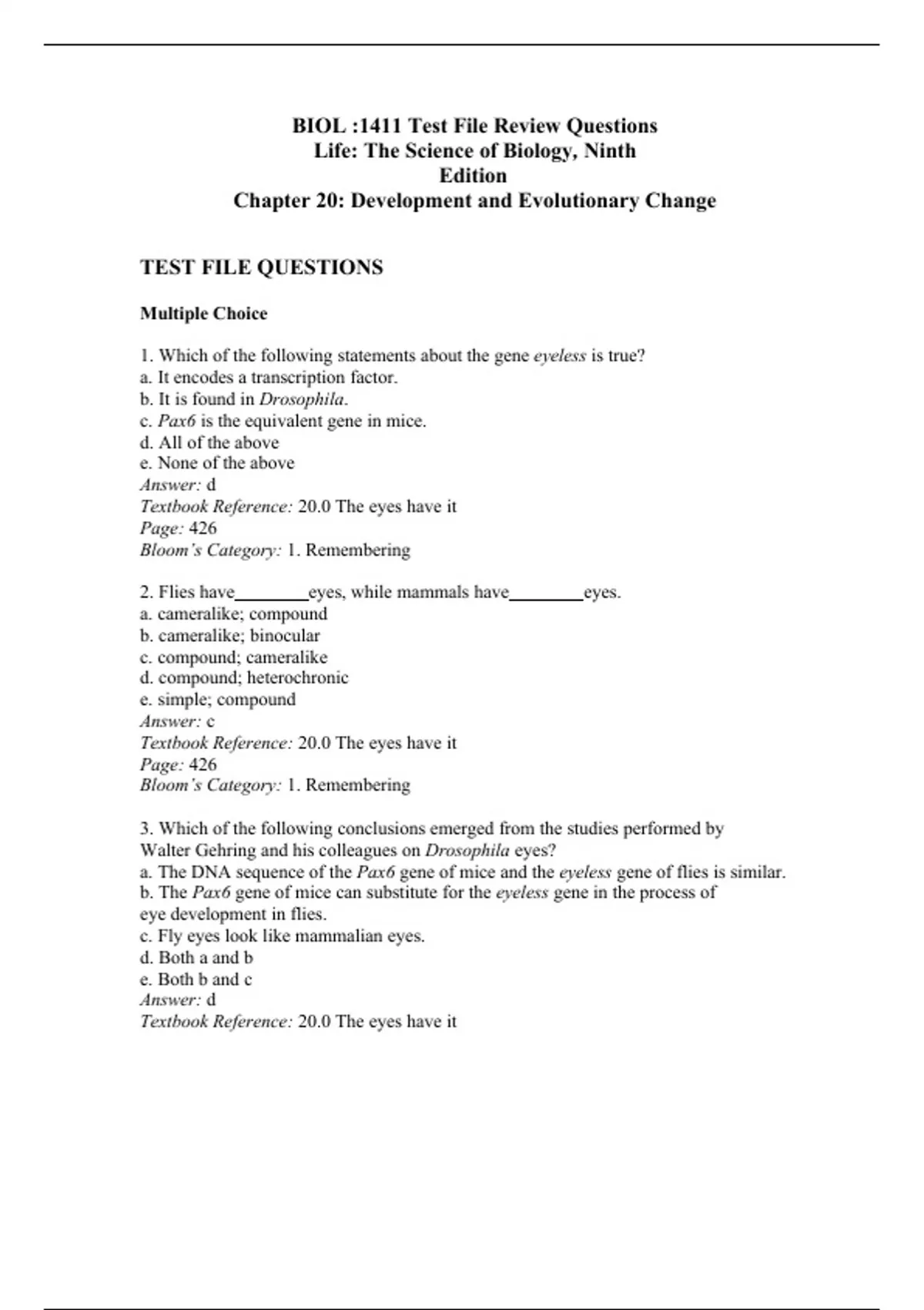BIOL :1411 Test File Review Questions Life: The Science of Biology, Ninth Edition Chapter 20: Development and Evolutionary Change TEST FILE QUESTIONS Multiple Choice 1. Which of the following statements about the gene eyeless is true? a. It encodes a transcription factor. b. It is found in Drosophila. c. Pax6 is the equivalent gene in mice. d. All of the above e. None of the above Answer: d Textbook Reference: 20.0 The eyes have it Page: 426 Bloom’s Category: 1. Remembering 2. Flies have eyes, while mammals have eyes. a. cameralike; compound b. cameralike; binocular c. compound; cameralike d. compound; heterochronic e. simple; compound Answer: c Textbook Reference: 20.0 The eyes have it Page: 426 Bloom’s Category: 1. Remembering 3. Which of the following conclusions emerged from the studies performed by Walter Gehring and his colleagues on Drosophila eyes? a. The DNA sequence of the Pax6 gene of mice and the eyeless gene of flies is similar. b. The Pax6 gene of mice can substitute for the eyeless gene in the process of eye development in flies. c. Fly eyes look like mammalian eyes. d. Both a and b e. Both b and c Answer: d Textbook Reference: 20.0 The eyes have it Page: 426 Bloom’s Category: 2. Understanding 4. Which of the following techniques or tools was instrumental in the studies performed by Gehring and his colleagues demonstrating that eyeless is a transcription factor involved in eye development? a. Comparison of DNA sequences by means of a database search b. Recombinant DNA constructs c. The genetic toolkit d. DNA chip technology e. Hormone treatments Answer: b Textbook Reference: 20.0 The eyes have it Page: 426 Bloom’s Category: 2. Understanding 5. Which of the following is not a general principle of evo-devo? a. Most animals share similar molecular mechanisms underlying development. b. Different developmental processes usually operate independently from one another. c. Changes in the timing of expression of particular genes often play a major role in morphological modifications that occur throughout evolution. d. Changes in the location of expression of particular genes often play a major role in morphological modifications that occur throughout evolution. e. All of the above are true; none is false. Answer: e Textbook Reference: 20.1 What Is Evo-Devo? Page: 427 Bloom’s Category: 1. Remembering 6. A mutation that affects the length of wing in a fly, but has little or no effect elsewhere in the body, would be explained by the phenomenon of a. heterochrony. b. homeosis. c. pleiotropy. d. developmental plasticity. e. modularity. Answer: e Textbook Reference: 20.1 What Is Evo-Devo? Page: 427 Bloom’s Category: 2. Understanding 7. In studies of gene expression, which of the following would be the least likely observation? a. Expression of a gene important in developmental processes varies with temperature. b. One insect species has a pair of wings that its relatives lack; these evolved as the result of a radically different developmental process. c. A species of fish is much larger than its relatives because of the much earlier expression of a gene that affects bone growth. d. The amino acid sequence of a Hox gene protein is extremely similar in nematodes and humans. e. The expression pattern of a gene important in development is more restricted in its spatial result in one rodent species than in all others; this leads to that species having a narrower face. Answer: b Textbook Reference: 20.1 What Is Evo-Devo? Page: 427 Bloom’s Category: 2. Understanding 8. Which of the following statements about Hox genes is false? a. They are part of the so-called genetic toolkit. b. There are expressed in similar patterns in the embryos of both mice and flies. c. They are arranged in similar clusters of genes in both mice and flies. d. Because of their important functional roles, they evolve rapidly in both mammals and flies. e. All of the above are true; none is false. Answer: d Textbook Reference: 20.1 What Is Evo-Devo? Page: 428 Bloom’s Category: 2. Understanding 9. The Pax6 gene in mammals and the eyeless gene in flies are both genes. a. heterochronic b. developmentally plastic c. homologous d. diapause e. modular Answer: c Textbook Reference: 20.1 What Is Evo-Devo? Page: 428 Bloom’s Category: 2. Understanding 10. If you know that a Hox gene, AbdB, is expressed in the most posterior part of the abdomen in a Drosophila embryo, which of the following conclusions about a homologous gene in humans would most likely be correct? a. There is no homologous gene to abdB in humans, because the evolutionary distance between humans and flies is so great. b. The homologous gene to abdB exists in humans, but it is expressed only in adults, not in human embryos. c. The homologous gene to abdB exists and is expressed in the head of human embryos. d. The homologous gene to abdB exists and is expressed throughout the human embryo in roughly equal amounts. e. The homologous gene to abdB exists and is expressed near the tail of the human embryo. Answer: e Textbook Reference: 20.1 What Is Evo-Devo? Page: 428 Bloom’s Category: 2. Understanding 11. Which of the following statements is true? a. Embryos are made up of modules. b. Adults are made up of modules. c. Many developmental genes exert their effects on only a single module. d. All of above e. None of the above Answer: d Textbook Reference: 20.2 How Can Mutations with Large Effects Change Only One Part of the Body? Page: 429 Bloom’s Category: 1. Remembering 12. Which of the following statements is false? a. Homologous genes encoding similar transcription factors are expressed in similar patterns along the anterior–posterior axes of both mammals and insects. b. The full-sized wing in Drosophila is normally produced on just the third thoracic segment. c. Deletions of the Ubx gene in Drosophila convert the third thoracic segment into the second thoracic segment. d. Ubx is a Hox gene. e. All of the above are true; none is false. Answer: b T