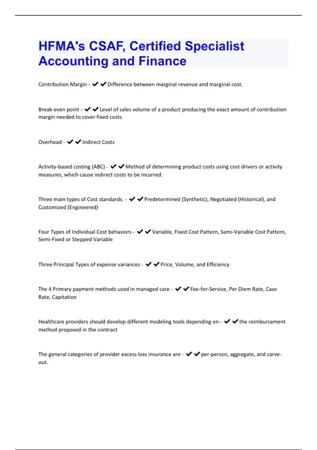 Contribution Margin - Difference between marginal revenue and marginal cost. Break-even point - Level of sales volume of a product producing the exact amount of contribution margin needed to cover fixed costs. Overhead - Indirect Costs Activity-based costing (ABC) - Method of determining product costs using cost drivers or activity measures, which cause indirect costs to be incurred. Three main types of Cost standards. - Predetermined (Synthetic), Negotiated (Historical), and Customized (Engineered) Four Types of Individual Cost behaviors - Variable, Fixed Cost Pattern, Semi-Variable Cost Pattern, Semi-Fixed or Stepped Variable Three Principal Types of expense variances - Price, Volume, and Efficiency The 4 Primary payment methods used in managed care - Fee-for-Service, Per Diem Rate, Case Rate, Capitation Healthcare providers should develop different modeling tools depending on - the reimbursement method proposed in the contract The general categories of provider excess loss insurance are - per-person, aggregate, and carveout.A Strategic Plan allows organizations to - have a clear plan as to why they are in business and how they can stay in business in the future. The main types of control budgets include - operating, capital, and cash. A budgeting process develops assumptions for the following: - Admissions, ALOS, Expense per visit, Inflation on expense, FTE per visit, Productivity on FTE per visit, Labor cost per FTE, Net Rev per visit Operating budget's statistical factors include - Historical statistics, Historical relationship of department volume, anticipated effects of new programs, clinical practice patters, covered lives in global payment risk programs, changes in regulatory environment, technical developments, process improvements, marketing efforts, demographic trends The primary purpose of measuring productivity is - for management to determine if resources are being used efficiently Budget types include - fixed and flexible The four budget variances used to explain by cause are - Volume, rate (charged), price (of a supply), and efficiency (cost per procedure).