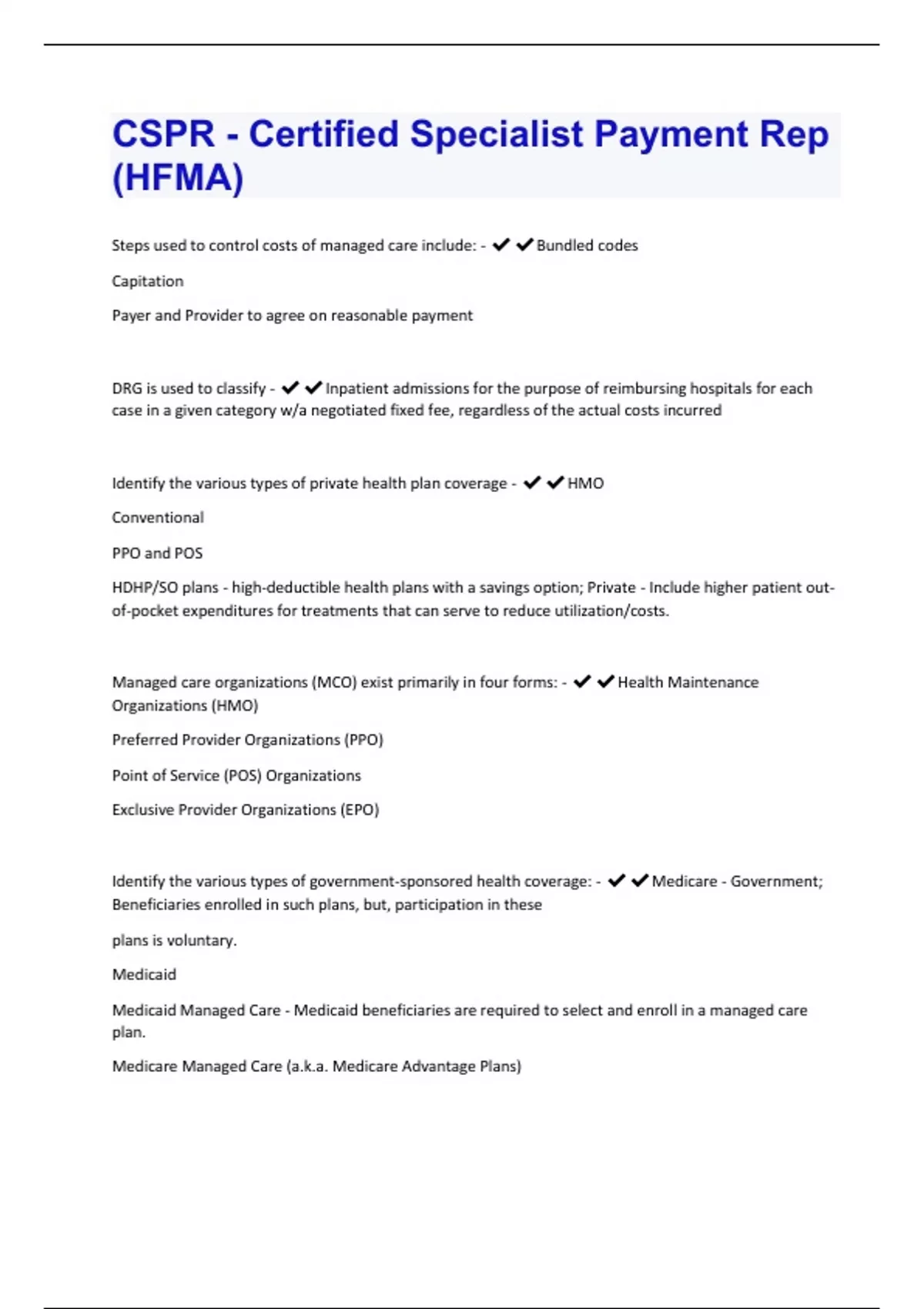 CSPR - Certified Specialist Payment Rep (HFMA) Questions and Answers with complete solution