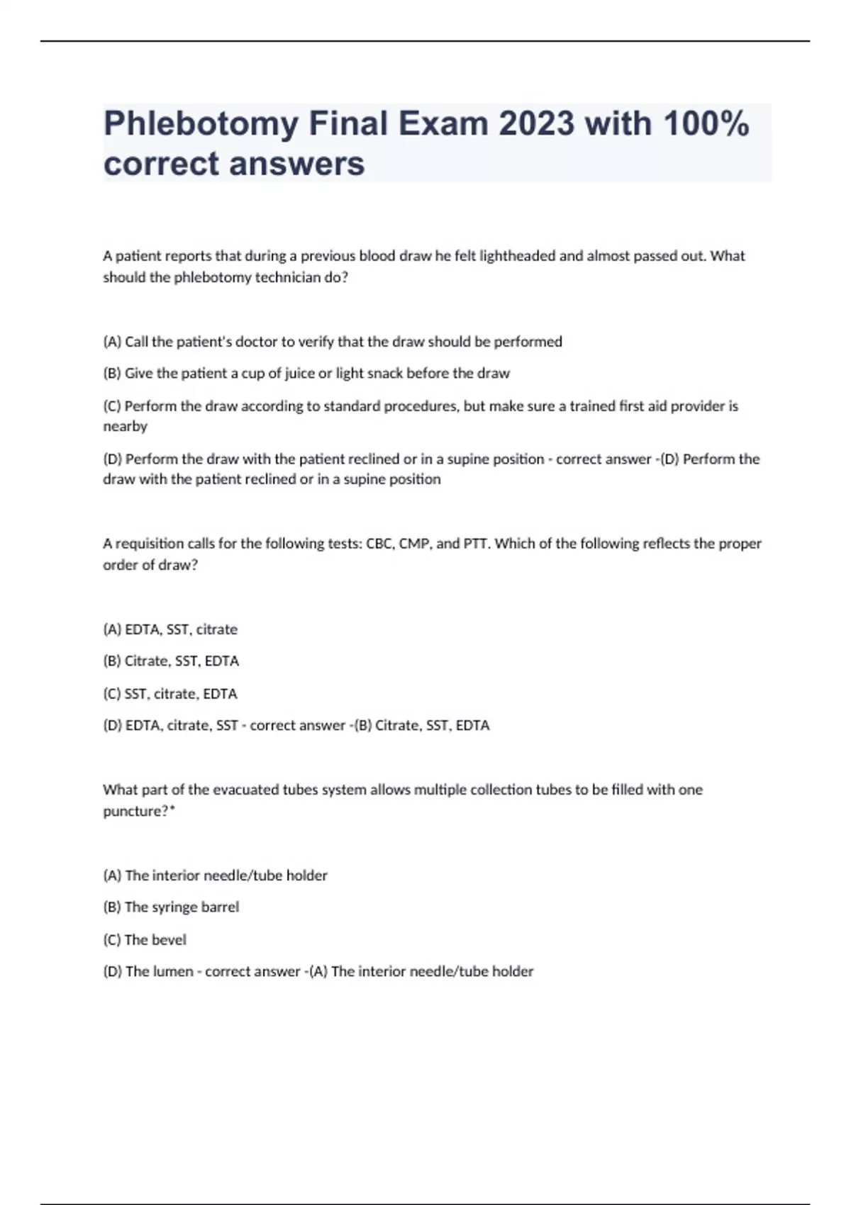 A patient reports that during a previous blood draw he felt lightheaded and almost passed out. What should the phlebotomy technician do? (A) Call the patient's doctor to verify that the draw should be performed (B) Give the patient a cup of juice or light snack before the draw (C) Perform the draw according to standard procedures, but make sure a trained first aid provider is nearby (D) Perform the draw with the patient reclined or in a supine position - correct answer -(D) Perform the draw with the patient reclined or in a supine position A requisition calls for the following tests: CBC, CMP, and PTT. Which of the following reflects the proper order of draw? (A) EDTA, SST, citrate (B) Citrate, SST, EDTA (C) SST, citrate, EDTA (D) EDTA, citrate, SST - correct answer -(B) Citrate, SST, EDTA What part of the evacuated tubes system allows multiple collection tubes to be filled with one puncture?* (A) The interior needle/tube holder (B) The syringe barrel (C) The bevel (D) The lumen - correct answer -(A) The interior needle/tube holder 4) When drawing a specimen for an ammonia test, what should a phlebotomy technician have ready for specimen transportation?* (A) A heating block (B) An amber transport tube (C) An ice slurry (D) Ice cubes - correct answer -(C) An ice slurry When blood culture is ordered along with other tests, which tube is filled first?* (A) Yellow ACD (B) Yellow SPS (C) Lavander EDTA (D) Light Blue sodium citrate - correct answer -(B) Yellow SPS Which of these patient reactions should be documented, but is not a cause for discontinuing a draw or likely to affect analytes? (A) Syncope in a seated patient (B) Petechiae