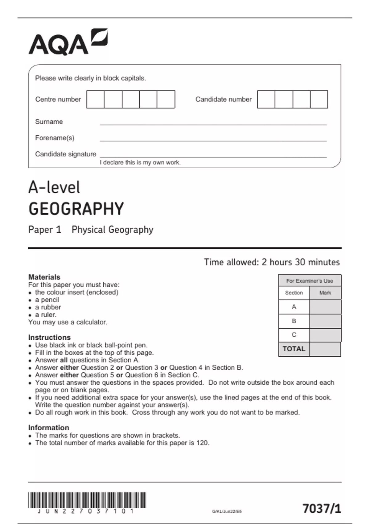 AQA A LEVEL GEOGRAPHY PAPER 1 QUESTION PAPER 2023 (7037-1: Physical Geography)