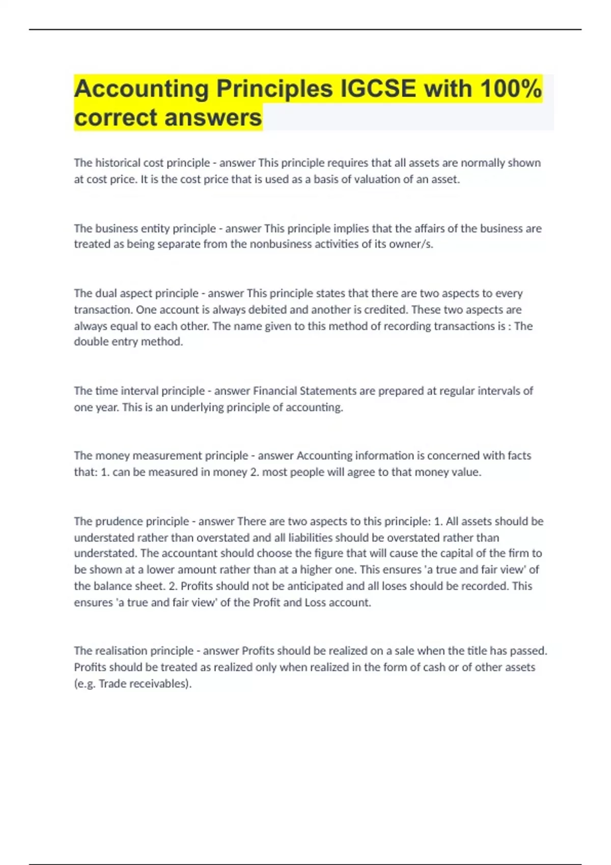 The historical cost principle This principle requires that all assets are normally shown at cost price. It is the cost price that is used as a basis of valuation of an asset. The business entity principle This principle implies that the affairs of the business are treated as being separate from the nonbusiness activities of its owner/s. The dual aspect principle This principle states that there are two aspects to every transaction. One account is always debited and another is credited. These two aspects are always equal to each other. The name given to this method of recording transactions is : The double entry method. The time interval principle Financial Statements are prepared at regular intervals of one year. This is an underlying principle of accounting. The money measurement principle Accounting information is concerned with facts that: 1. can be measured in money 2. most people will agree to that money value. The prudence principle There are two aspects to this principle: 1. All assets should be understated rather than overstated and all liabilities should be overstated rather than understated. The accountant should choose the figure that will cause the capital of the firm to be shown at a lower amount rather than at a higher one. This ensures 'a true and fair view' of the balance sheet. 2. Profits should not be anticipated and all loses should be recorded. This ensures 'a true and fair view' of the Profit and Loss account. The realisation principle Profits should be realized on a sale when the title has passed. Profits should be treated as realized only when realized in the form of cash or of other assets (e.g. Trade receivables). The going concern principle This principle implies that the business will continue to operate for the foreseeable future. Consistency Once a firm has fixed a method for the accounting treatment of an item, it will enter all similar items that follow in the same way. If the firm does change the method, it should be after a lot of consideration. If profits are affected by a material amount due to a change then, either in the profit and loss account itself or in the reports accompanying it, the effect of the change should be stated. The accruals principle This principle states that the difference between the revenues and expenses is the net profit for the accounting period. It should be remembered that the revenues and expenses should be taken into account according to the matching principle which states that all expenses and income relating to the financial period to which the accounts relate should be taken into account without regard to the date of payment or receipt, respectively.