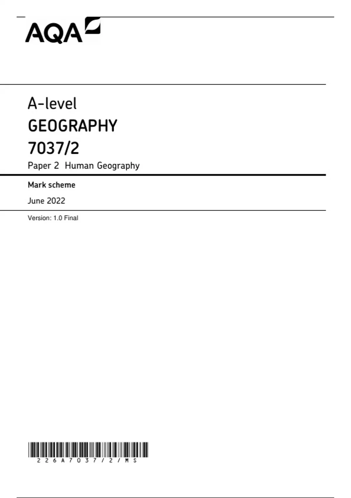 AQA A LEVEL GEOGRAPHY PAPER 2 MARK SCHEME 2023 (7037-2: Human Geography)