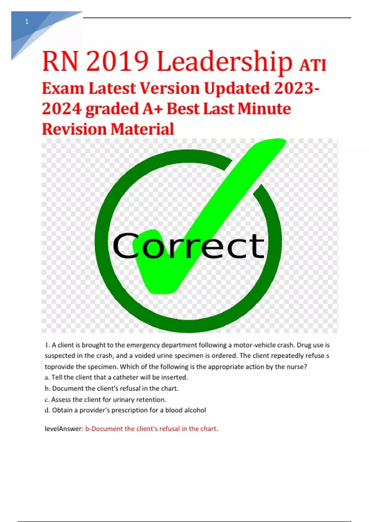 RN 2019 Leadership ATI Exam Latest Version Updated 2023- 2024 graded A+ Best Last Minute Revision Material
