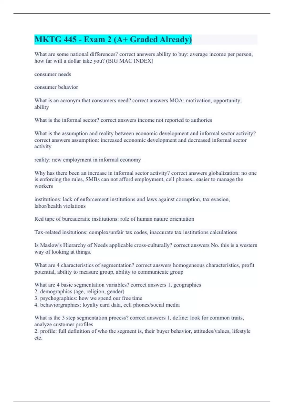 What are some national differences? correct answers ability to buy: average income per person, how far will a dollar take you? (BIG MAC INDEX) consumer needs consumer behavior What is an acronym that consumers need? correct answers MOA: motivation, opportunity, ability What is the informal sector? correct answers income not reported to authories What is the assumption and reality between economic development and informal sector activity? correct answers assumption: increased economic development and decreased informal sector activity reality: new employment in informal economy Why has there been an increase in informal sector activity? correct answers globalization: no one is enforcing the rules, SMBs can not afford employment, cell phones.. easier to manage the workers institutions: lack of enforcement institutions and laws against corruption, tax evasion, labor/health violations Red tape of bureaucratic institutions: role of human nature orientation Tax-related insitutions: complex/unfair tax codes, inaccurate tax institutions calculations Is Maslow's Hierarchy of Needs applicable cross-culturally? correct answers No. this is a western way of looking at things. What are 4 characteristics of segmentation? correct answers homogeneous characteristics, profit potential, ability to measure group, ability to communicate group What are 4 basic segmentation variables? correct answers 1. geographics 2. demographics (age, religion, gender) 3. psychographics: how we spend our free time 4. behaviorgraphics: loyalty card data, cell phones/social media What is the 3 step segmentation process? correct answers 1. define: look for common traits, analyze customer profiles 2. profile: full definition of who the segment is, their buyer behavior, attitudes/values, lifestyle etc.