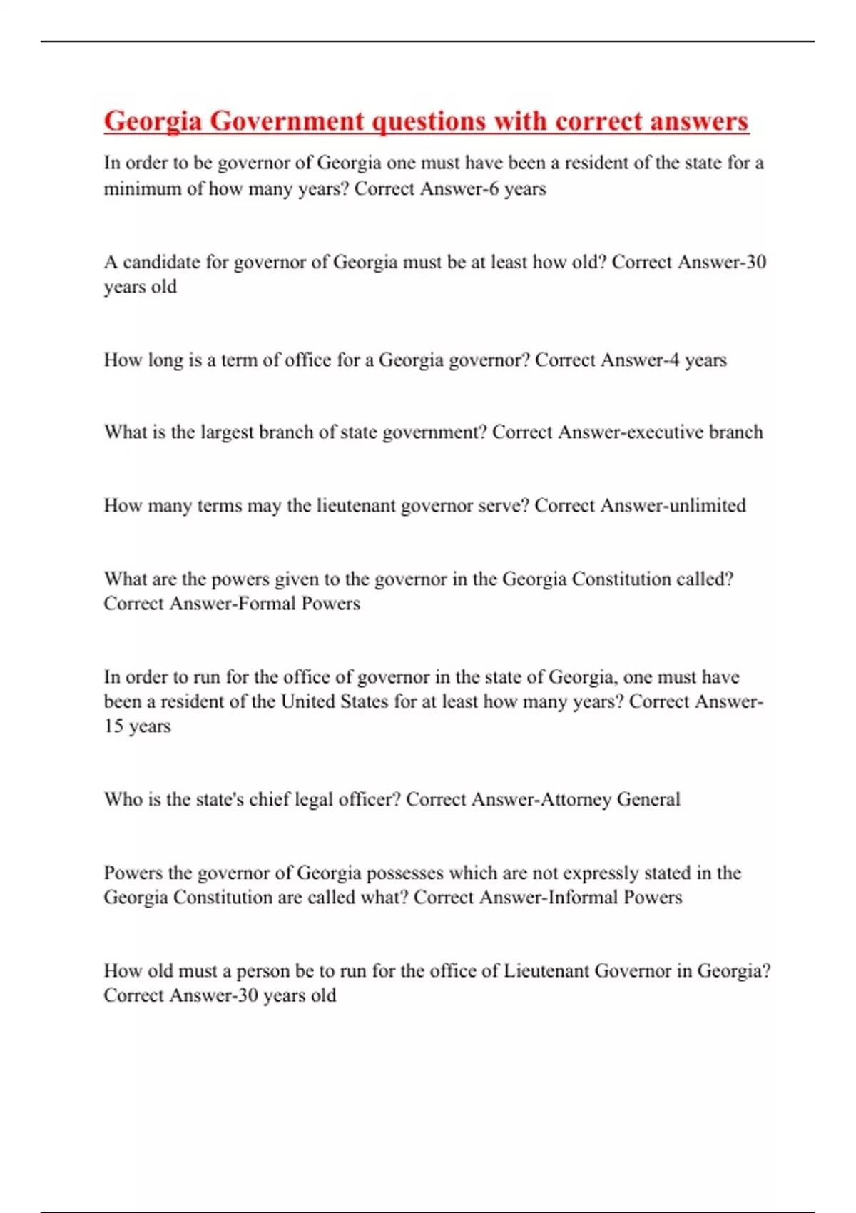 In order to be governor of Georgia one must have been a resident of the state for a minimum of how many years? Correct Answer-6 years A candidate for governor of Georgia must be at least how old? Correct Answer-30 years old How long is a term of office for a Georgia governor? Correct Answer-4 years What is the largest branch of state government? Correct Answer-executive branch How many terms may the lieutenant governor serve? Correct Answer-unlimited What are the powers given to the governor in the Georgia Constitution called? Correct Answer-Formal Powers In order to run for the office of governor in the state of Georgia, one must have been a resident of the United States for at least how many years? Correct Answer-15 years Who is the state's chief legal officer? Correct Answer-Attorney General Powers the governor of Georgia possesses which are not expressly stated in the Georgia Constitution are called what? Correct Answer-Informal Powers How old must a person be to run for the office of Lieutenant Governor in Georgia? Correct Answer-30 years old