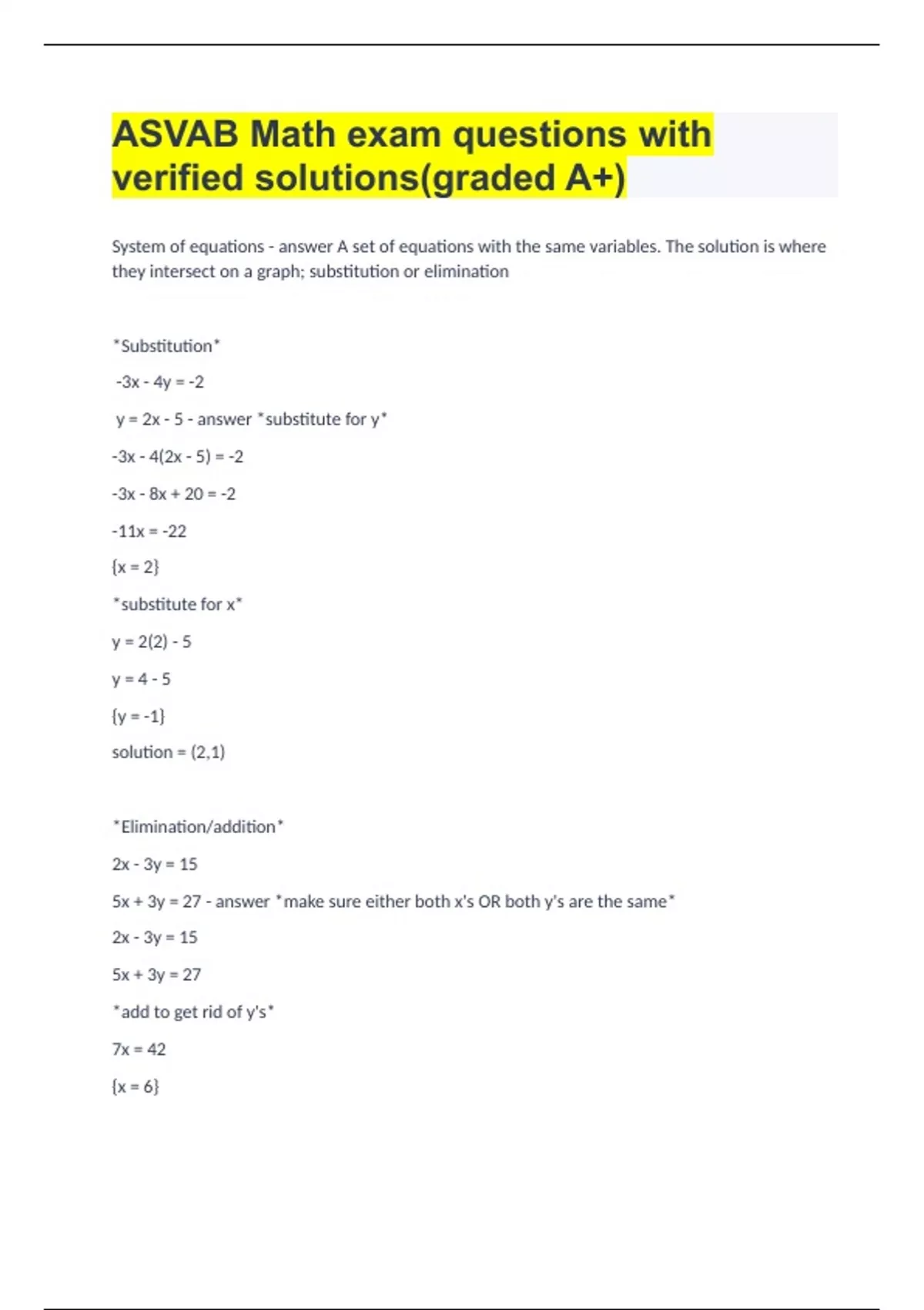 ASVAB Math exam questions with verified solutions(graded A+).