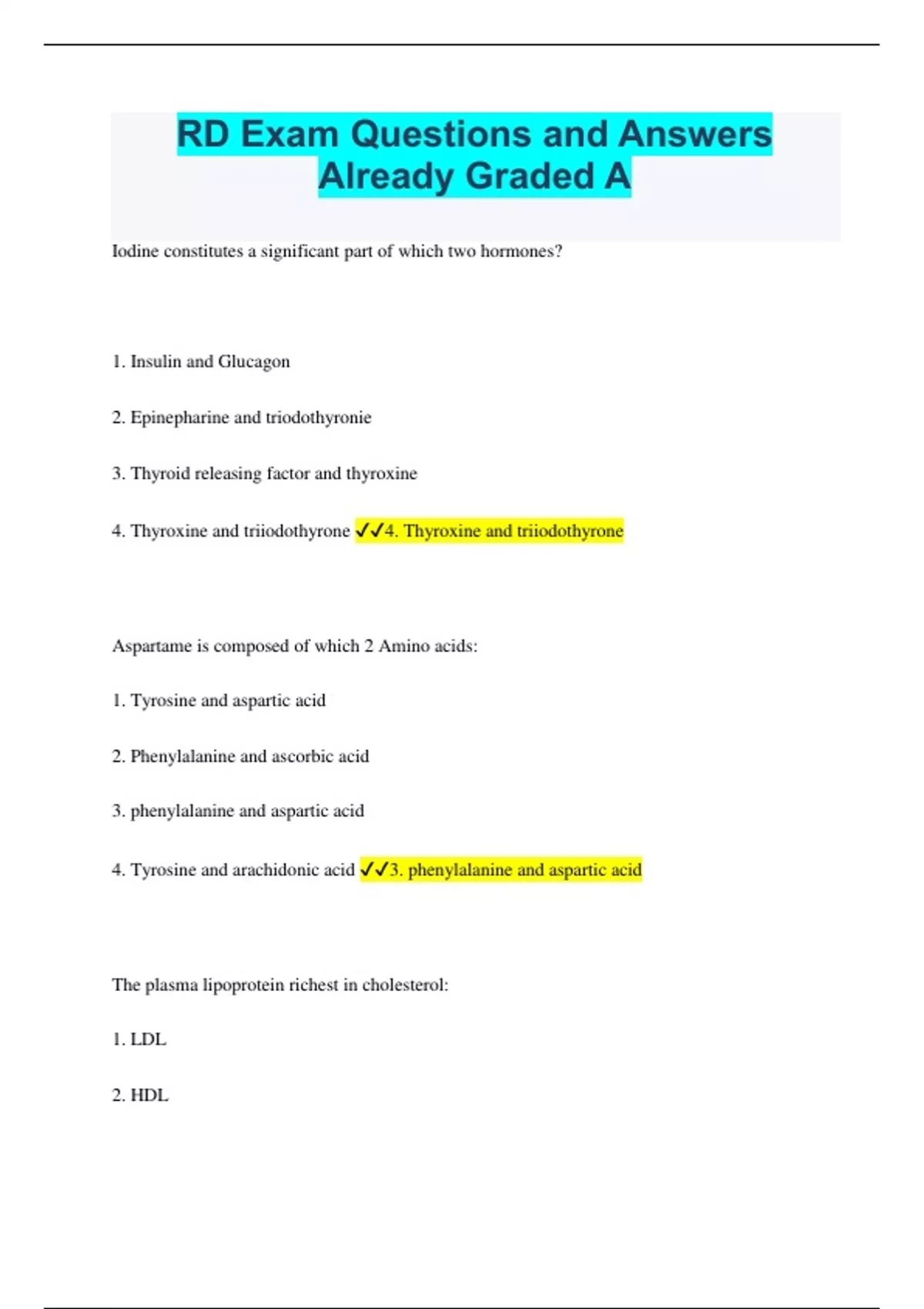 RD Exam Questions and Answers Already Graded A Iodine constitutes a significant part of which two hormones? 1. Insulin and Glucagon 2. Epinepharine and triodothyronie 3. Thyroid releasing factor and thyroxine 4. Thyroxine and triiodothyrone 4. Thyroxine and triiodothyrone Aspartame is composed of which 2 Amino acids: 1. Tyrosine and aspartic acid 2. Phenylalanine and ascorbic acid 3. phenylalanine and aspartic acid 4. Tyrosine and arachidonic acid 3. phenylalanine and aspartic acid The plasma lipoprotein richest in cholesterol: 1. LDL 2. HDL 3. VLDL 4. Chylomicron 1. LDL are composed of 50% cholesterol which nutrient was not included in the grain enrichment legislation? Pyridoxine thiamine folate niacin Pyridoxine (B6) All grain products must be enriched with thiamine, niacin, riboflavin, iron and folate The electrolytes which exist as ions in body fluids are: 1. Sodium, Potassium and magnesium 2. Sodium, Sulfer and chloride 3. Sodium, Potassium and chloride 4. Phosphorus, potassium and chloride Sodium, Potassium and chloride Carbohydrtates start digesting in the _________ Proteins start digestiong in the ________ 1. Mouth (Amylase) 2. Stomach which of the following nutrients in necessary in the transportation of long chain fatty acids? 1. Coenzyme Q10 2. Bioflavonionds 3. inositol 4. Carnitine 4. Carnitine - transport of LCFA into the mitochondria for oxidation as sources of energy The BMI is measured by: 1. Ht (meters squared) / wt (kg) 2. Wt (lbs)/ht (inches) 3. Wt (kg)/ht (meters squared) 3. Wt (kg)/ht (meters squared) monoglycerides and free fatty acids are carried across the intestinal mucosal cells by: 1. Triglycerides 2. lipoproteins 3. chylomicrons 4. micelles Micelles : Carry monoglyceridese and Free fatty