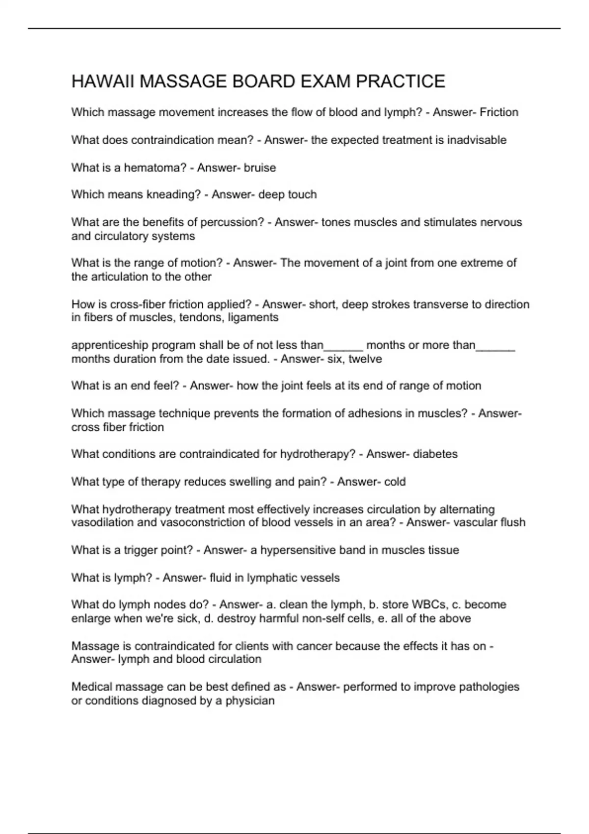 Which massage movement increases the flow of blood and lymph? - Answer- Friction What does contraindication mean? - Answer- the expected treatment is inadvisable What is a hematoma? - Answer- bruise Which means kneading? - Answer- deep touch What are the benefits of percussion? - Answer- tones muscles and stimulates nervous and circulatory systems What is the range of motion? - Answer- The movement of a joint from one extreme of the articulation to the other How is cross-fiber friction applied? - Answer- short, deep strokes transverse to direction in fibers of muscles, tendons, ligaments apprenticeship program shall be of not less than______ months or more than______ months duration from the date issued. - Answer- six, twelve What is an end feel? - Answer- how the joint feels at its end of range of motion Which massage technique prevents the formation of adhesions in muscles? - Answer- cross fiber friction What conditions are contraindicated for hydrotherapy? - Answer- diabetes What type of therapy reduces swelling and pain? - Answer- cold What hydrotherapy treatment most effectively increases circulation by alternating vasodilation and vasoconstriction of blood vessels in an area? - Answer- vascular flush What is a trigger point? - Answer- a hypersensitive band in muscles tissue What is ly