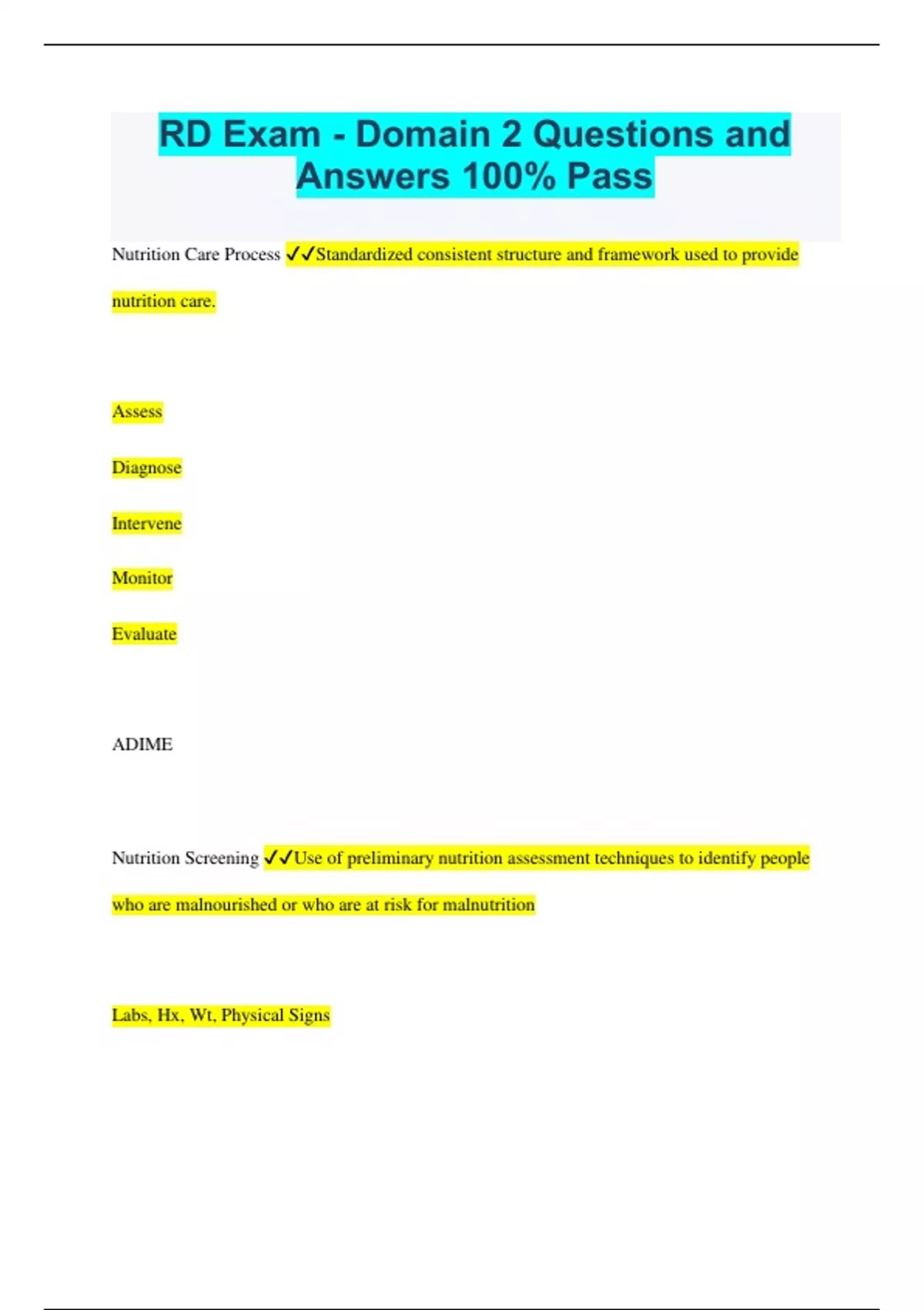 RD Exam - Domain 2 Questions and Answers 100% Pass Nutrition Care Process Standardized consistent structure and framework used to provide nutrition care. Assess Diagnose Intervene Monitor Evaluate ADIME Nutrition Screening Use of preliminary nutrition assessment techniques to identify people who are malnourished or who are at risk for malnutrition Labs, Hx, Wt, Physical Signs Screening and referral bring people into the nutrition care process Joint Commission Nutrition risk identified in hospitalized patients with 24 hours of admission, but does not mandate a method of screening patients Screening Tools Subjective Global Assessment (Hx, Intake, GI, Functional Capacity, Physical Appearance, Edema, Wt) Mini Nutritional Assessment (Independence, Medication, # meals, Protein, Fruits/Veg) Nutrition Screening Initiative (Elderly) Nutrition Assessment Provides the basis for the nutrition diagnosis Review Cluster Identify Requires critical thinking skills Indicators Clearing defined markers that can be observed and measured Nutrition care criteria What indicators are compared against Dietary Intake Assessment Diet Hx Food Recall 24 Hour Recall Food Frequency Nutrition Focused Physical Exam Hair: thin, sparse, dull, dry, brittle - indicators of vitamin C, protein deficiency Eyes: pale, dry, poor vision - vitamin A, zinc, or riboflavin deficiency Lips: swollen, red, dry, cracked - riboflavin, pyridoxine, niacin deficiencies Tongue - smooth, slick, purple, white - vitamin or iron deficiencies Gums - sore, red, swollen, bleeding - vitamin C deficiency Teeth - missing, loss - Ca deficiency, poor intake