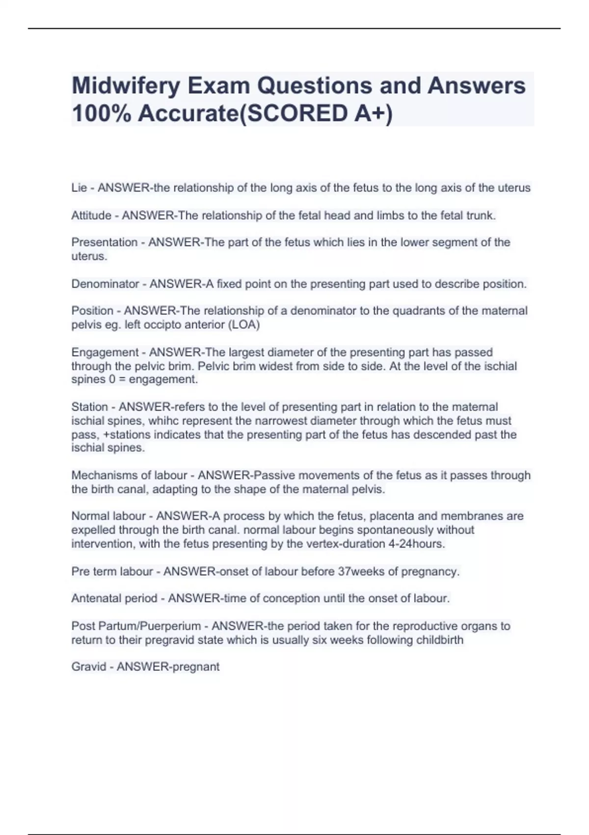 Lie - ANSWER-the relationship of the long axis of the fetus to the long axis of the uterus Attitude - ANSWER-The relationship of the fetal head and limbs to the fetal trunk. Presentation - ANSWER-The part of the fetus which lies in the lower segment of the uterus. Denominator - ANSWER-A fixed point on the presenting part used to describe position. Position - ANSWER-The relationship of a denominator to the quadrants of the maternal pelvis eg. left occipto anterior (LOA) Engagement - ANSWER-The largest diameter of the presenting part has passed through the pelvic brim. Pelvic brim widest from side to side. At the level of the ischial spines 0 = engagement. Station - ANSWER-refers to the level of presenting part in relation to the maternal ischial spines, whihc represent the narrowest diameter through which the fetus must pass, +stations indicates that the presenting part of the fetus has descended past the ischial spines. Mechanisms of labour - ANSWER-Passive movements of the fetus as it passes through the birth canal, adapting to the shape of the maternal pelvis. Normal labour - ANSWER-A process by which the fetus, placenta and membranes are expelled through the birth canal. normal labour begins spontaneously without intervention, with the fetus presenting by the vertex-duration 4-24hours. Pre term labour - ANSWER-onset of labour before 37weeks of pregnancy. Antenatal period - ANSWER-time of conception until the onset of labour. Post Partum/Puerperium - ANSWER-the period taken for the reproductive organs to return to their pregravid state which is usually six weeks following childbirth Gravid - ANSWER-pregnant Para - ANSWER-this term is used to describMidwifery Exam Questions and Answers 100% Accurate(SCORED A+)