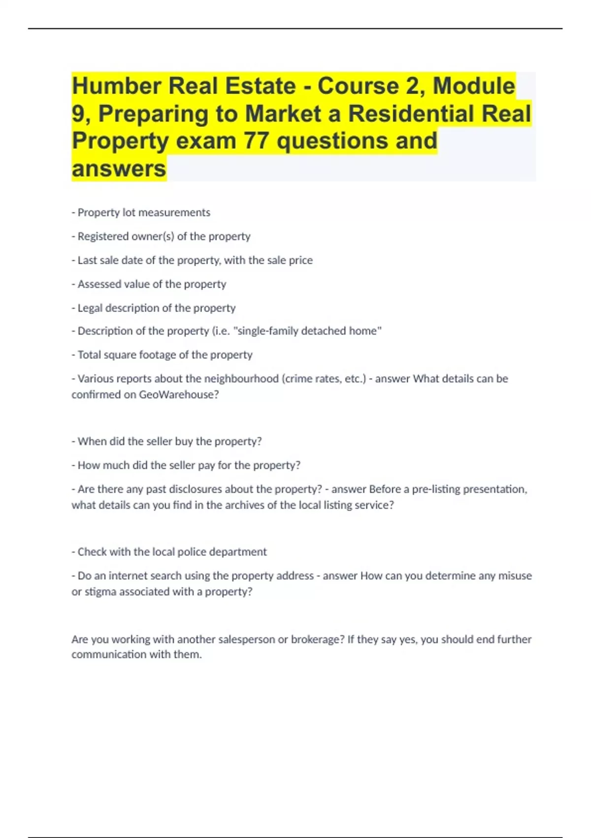Humber Real Estate - Course 2, Module 9, Preparing to Market a Residential Real Property exam| 77 questions and answers