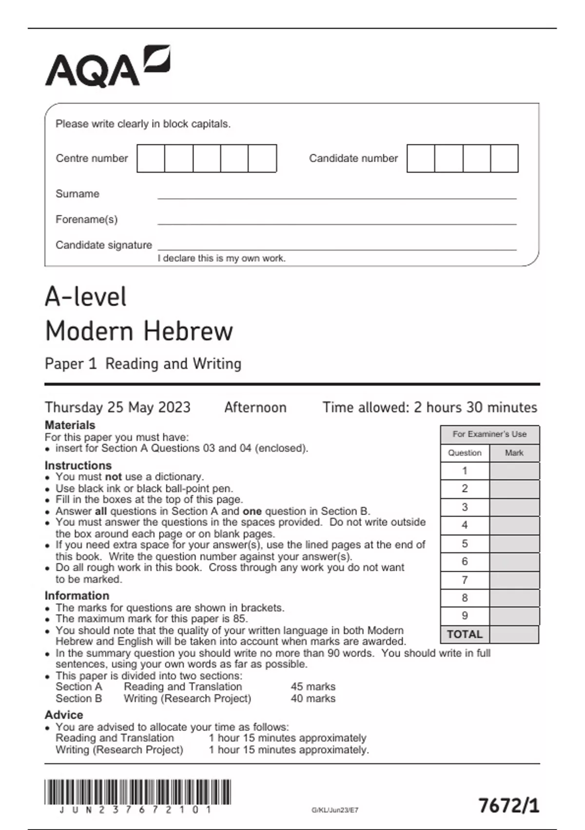 AQA A LEVEL MODERN HEBREW PAPER 1 QUESTION PAPER 2023 (7672-1: Reading and Writing)