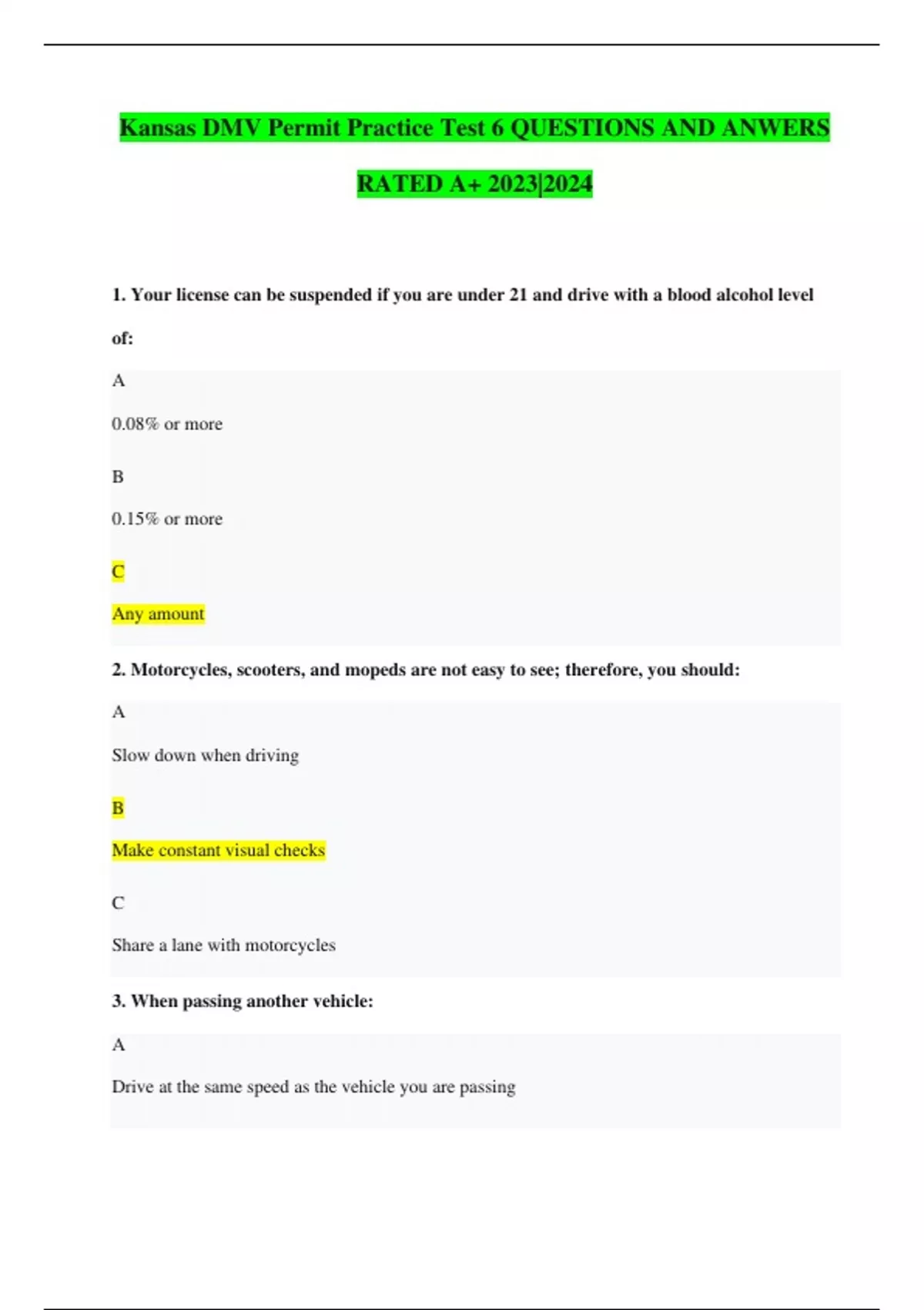 Kansas DMV Permit Practice Test 6 QUESTIONS AND ANWERS RATED A+ 2023|2024 1. Your license can be suspended if you are under 21 and drive with a blood alcohol level of: A 0.08% or more B 0.15% or more C Any amount 2. Motorcycles, scooters, and mopeds are not easy to see; therefore, you should: A Slow down when driving B Make constant visual checks C Share a lane with motorcycles 3. When passing another vehicle: A Drive at the same speed as the vehicle you are passing B Pass the vehicle as safely and as quickly as possible C Pass the vehicle as slowly as possible 4. It is night. A vehicle coming towards you has its high beams on which make it hard to see the road ahead, you should: A Look ahead towards the right edge of your lane B Look straight ahead in your lane C Look ahead towards the left edge of your lane 5. This sign means: A Side Road B Merge C Yield Right-of-Way 6. What is the only effective way to remove alcohol from the body? A Time B Strong coffee C Cold Shower 7. This sign means: A a left turn can be made only after stopping B all traffic must turn right at next intersection C no left turn can be made