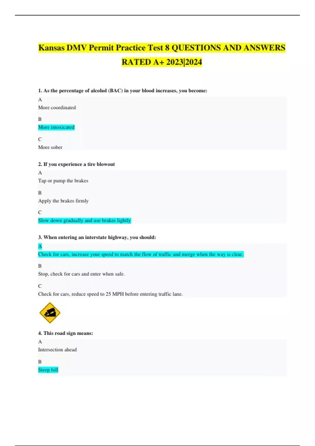 Kansas DMV Permit Practice Test 8 QUESTIONS AND ANSWERS RATED A+ 2023|2024 1. As the percentage of alcohol (BAC) in your blood increases, you become: A More coordinated B More intoxicated C More sober 2. If you experience a tire blowout A Tap or pump the brakes B Apply the brakes firmly C Slow down gradually and use brakes lightly 3. When entering an interstate highway, you should: A Check for cars, increase your speed to match the flow of traffic and merge when the way is clear. B Stop, check for cars and enter when safe. C Check for cars, reduce speed to 25 MPH before entering traffic lane. 4. This road sign means: A Intersection ahead B Steep hill C Merging traffic 5. Stopping distances and severity of crashes A Are not affected by vehicle speed B Decrease as vehicle speed increases C Increase as vehicle speed increases 6. Stopping distances and severity of crashes: A Increase as vehicle speed increases B Are not affected by vehicle speed C Decrease as vehicle speed increases 7. This road sign means A jogging trail B pedestrian cross