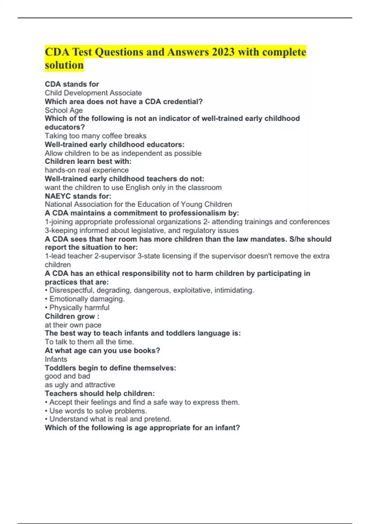 CDA Test Questions and Answers 2023 with complete solution CDA stands for Child Development Associate Which area does not have a CDA credential? School Age Which of the following is not an indicator of well-trained early childhood educators? Taking too many coffee breaks Well-trained early childhood educators: Allow children to be as independent as possible Children learn best with: hands-on real experience Well-trained early childhood teachers do not: