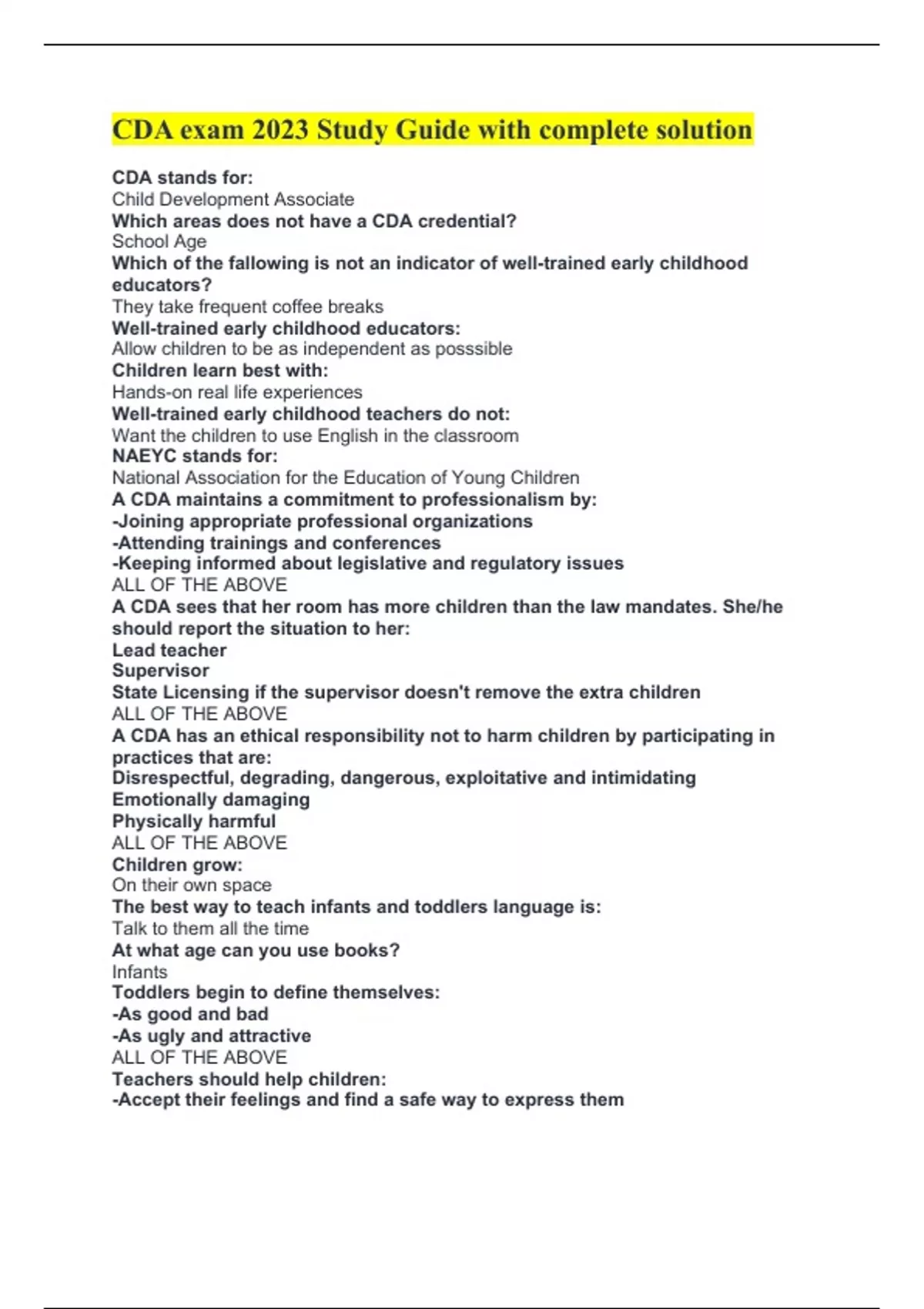 CDA exam 2023 Study Guide with complete solution CDA stands for: Child Development Associate Which areas does not have a CDA credential? School Age Which of the fallowing is not an indicator of well-trained early childhood educators? They take frequent coffee breaks Well-trained early childhood educators: Allow children to be as independent as posssible Children learn best with: Hands-on real life experiences Well-trained early childhood teachers do not: Want the children to use English in the classroom NAEYC stands for: National Association for the Education of Young Children A CDA maintains a commitment to professionalism by: -Joining appropriate professional organizations -Attending trainings and conferences -Keeping informed about legislative and regulatory issues ALL OF THE ABOVE A CDA sees that her room has more children than the law mandates. She/he should report the situation to her: Lead teacher Supervisor State Licensing if the supervisor doesn't remove the extra children ALL OF THE ABOVE A CDA has an ethical responsibility not to harm children by participating in practices that are: Disrespectful, degrading, dangerous