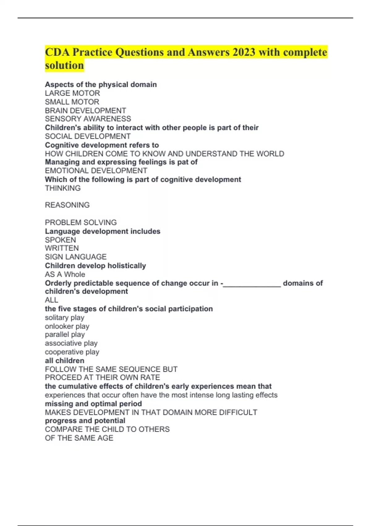 CDA Practice Questions and Answers 2023 with complete solution Aspects of the physical domain LARGE MOTOR SMALL MOTOR BRAIN DEVELOPMENT SENSORY AWARENESS Children's ability to interact with other people is part of their SOCIAL DEVELOPMENT Cognitive development refers to HOW CHILDREN COME TO KNOW AND UNDERSTAND THE WORLD Managing and expressing feelings is pat of EMOTIONAL DEVELOPMENT Which of the following is part of cognitive development THINKING REASONING PROBLEM SOLVING Language development includes SPOKEN WRITTEN SIGN LANGUAGE Children develop holistically AS A Whole Orderly predictable sequence of change occur in -______________ domains of children's development ALL the five stages of children's social participation solitary play onlooker play parallel play associative play cooperative play