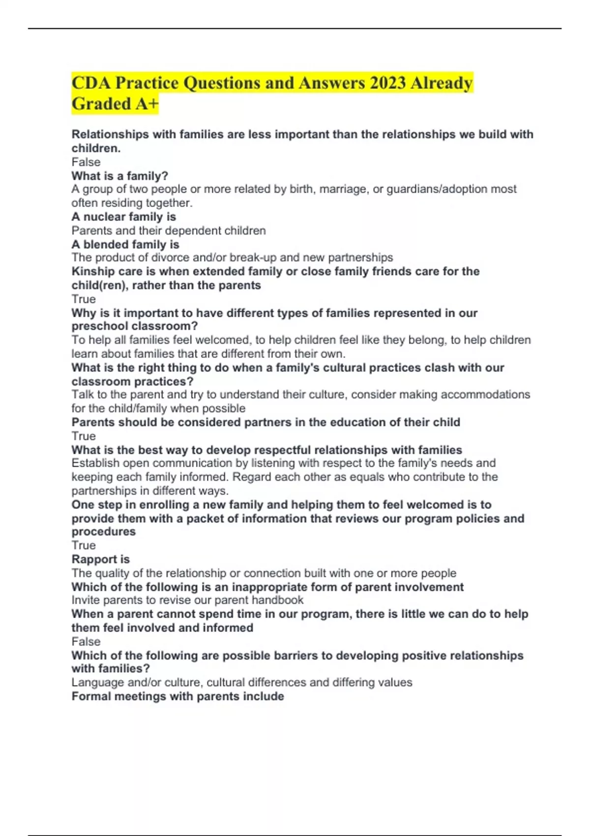 CDA Practice Questions and Answers 2023 Already Graded A+ Relationships with families are less important than the relationships we build with children. False What is a family? A group of two people or more related by birth, marriage, or guardians/adoption most often residing together. A nuclear family is Parents and their dependent children A blended family is The product of divorce and/or break-up and new partnerships Kinship care is when extended family or close family friends care for the child(ren), rather than the parents True Why is it important to have different types of families represented in our preschool classroom? To help all families feel welcomed, to help children feel like they belong, to help children learn about families that are different from their own. What is the right thing to do when a family's cultural practices clash with our classroom practices? Talk to the parent and try to understand their culture, consider making accommodations for the child/family when possible Parents should