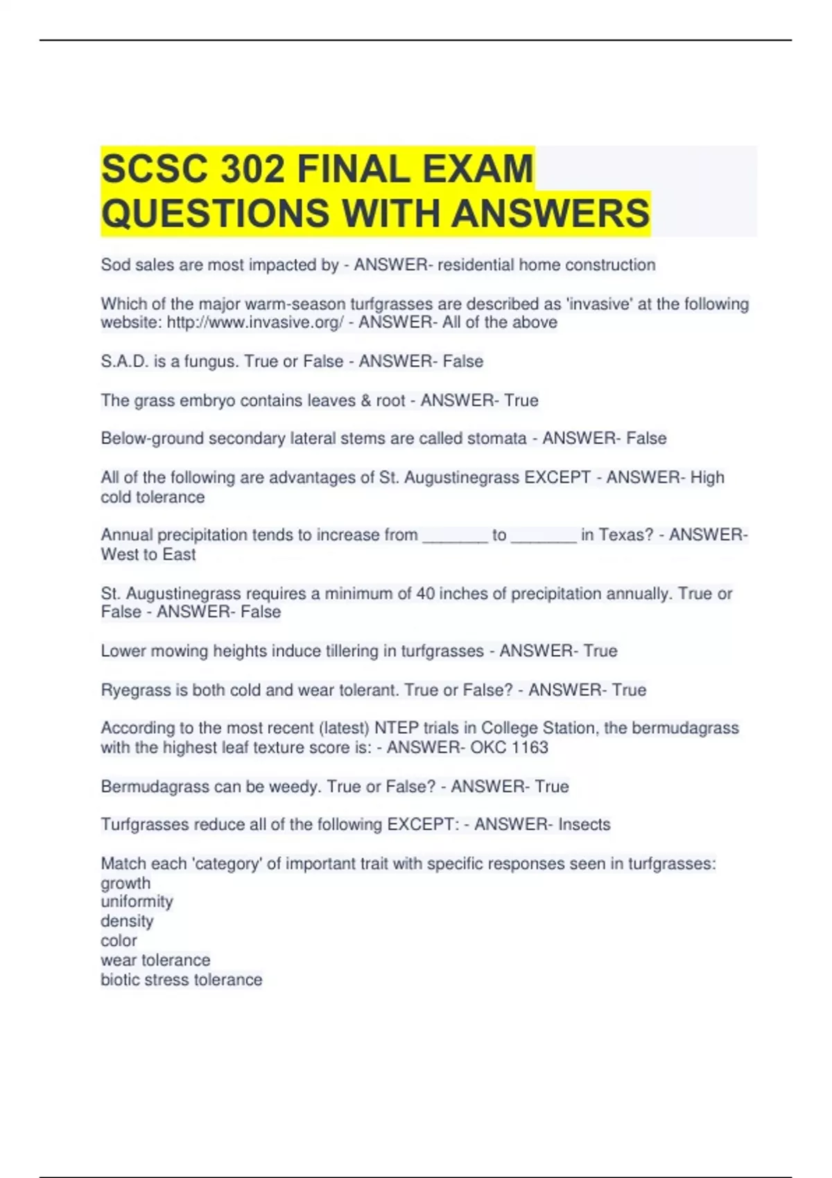 SCSC 302 FINAL EXAM QUESTIONS WITH ANSWERS Sod sales are most impacted by - ANSWER- residential home construction Which of the major warm-season turfgrasses are described as 'invasive' at the following website: S.A.D. is a fungus. True or False - ANSWER- False The grass embryo contains leaves & root - ANSWER- True Below-ground secondary lateral stems are called stomata - ANSWER- False All of the following are advantages of St. Augustinegrass EXCEPT - ANSWER- High cold tolerance Annual precipitation tends to increase from _______ to _______ in Texas? - ANSWER- West to East St. Augustinegrass requires a minimum of 40 inches of precipitation annually. True or False - ANSWER- False Lower mowing heights induce tillering in turfgrasses - ANSWER- True Ryegrass is both cold and wear tolerant. True or False? - ANSWER- True According to the most recent (latest) NTEP trials in College Station, the bermudagrass with the highest leaf texture score is: - ANSWER- OKC 1163 Bermudagrass can be weedy. True or False? - ANSWER- True Turfgrasses reduce all of the following EXCEPT: - ANSWER- Insects Match each 'category' of important trait with specific responses seen in turfgrasses: growth uniformity density color wear tolerance biotic stress tolerance abiotic stress tolerance seed/sod production - ANSWER- bunch, intermediate, sod-forming mowing cut cleanliness shoot number vs. internode length diseases/ nutrient status tensile strength pests drought commercial viability What are the advantages of artificial turf? - ANSWER- low maintenance What industry has the higest economic impact on turf grasses? - ANSWER- Golf Courses What is the most shade tolerant warm season turf grass? - ANSWER- St. Augustinegrass The most common hybrid bermudagrass found on sportsfields and fairways; it is considered the "industry standard" for warm season sportsturf - ANSWER- Tifway Hybrid bermudagrass is available via inexpensive seed. T or F? - ANSWER- False Which of the following is not a warm-arid adapted turfgrass? - ANSWER- bentgrass Buffalograss has an intermediate growth form. True or False. - ANSWER- False Cool season turf grasses are considered C3 ? True or False - ANSWER- True Ryegrass is considered drought tolerant. T or F? - ANSWER- False Turfgrasses increase: - ANSWER- home values Bentgrass can be a weed. True or False? - ANSWER- True A low maintenance turfgrass that is not used for high quality lawns because of its lack of density and unsightly seedheads is: - ANSWER- bahiagrass Sod sales have historically decreased during recessions. True or False? - ANSWER- False Grass leaf margins, collars, ligules, and sheaths can be hairy. - ANSWER- True Bermudagrass has: - ANSWER- both stolons and rhizomes