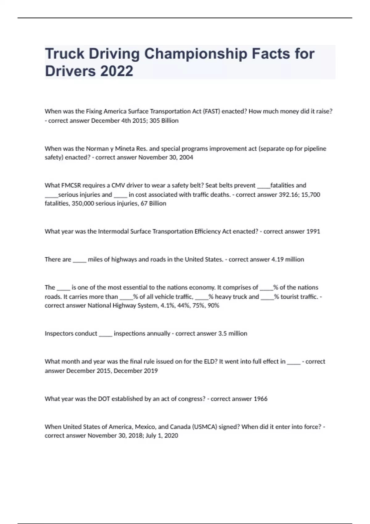 Truck Driving Championship Facts for Drivers 2022When was the Fixing America Surface Transportation Act (FAST) enacted? How much money did it raise? - correct answer December 4th 2015; 305 Billion When was the Norman y Mineta Res. and special programs improvement act (separate op for pipeline safety) enacted? - correct answer November 30, 2004 What FMCSR requires a CMV driver to wear a safety belt? Seat belts prevent ____fatalities and ____serious injuries and ____ in cost associated with traffic deaths. - correct answer 392.16; 15,700 fatalities, 350,000 serious injuries, 67 Billion What year was the Intermodal Surface Transportation Efficiency Act enacted? - correct answer 1991 There are ____ miles of highways and roads in the United States. - correct answer 4.19 million The ____ is one of the most essential to the nations economy. It comprises of ____% of the nations roads. It carries more than ____% of all vehicle traffic, ____% heavy truck and ____% tourist traffic. - correct answer National Highway System, 4.1%, 44%, 75%, 90% Inspectors conduct ____ inspections annually - correct answer 3.5 million What month and year was the final rule issued on for the ELD? It went into full effect in ____ - correct answer December 2015, December 2019 What year was the DOT established by an act of congress? - correct answer 1966 When United States of America, Mexico, and Canada (USMCA) signed? When did it enter into force? - correct answer November 30, 2018; July 1, 2020