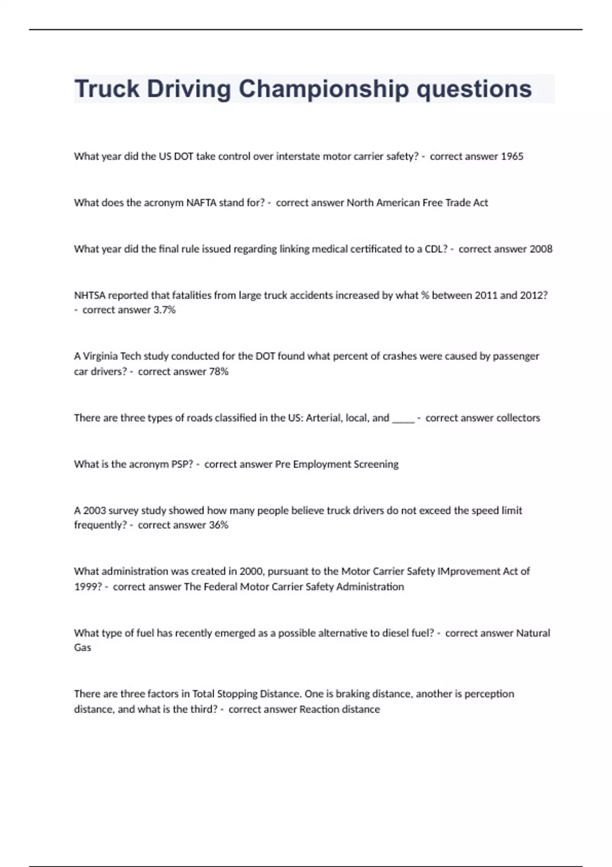 Truck Driving Championship questionsWhat year did the US DOT take control over interstate motor carrier safety? - correct answer 1965 What does the acronym NAFTA stand for? - correct answer North American Free Trade Act What year did the final rule issued regarding linking medical certificated to a CDL? - correct answer 2008 NHTSA reported that fatalities from large truck accidents increased by what % between 2011 and 2012? - correct answer 3.7% A Virginia Tech study conducted for the DOT found what percent of crashes were caused by passenger car drivers? - correct answer 78% There are three types of roads classified in the US: Arterial, local, and ____ - correct answer collectors What is the acronym PSP? - correct answer Pre Employment Screening A 2003 survey study showed how many people believe truck drivers do not exceed the speed limit frequently? - correct answer 36% What administration was created in 2000, pursuant to the Motor Carrier Safety IMprovement Act of 1999? - correct answer The Federal Motor Carrier Safety Administration What type of fuel has recently emerged as a possible alternative to diesel fuel? - correct answer Natural Gas There are three factors in Total Stopping Distance. One is braking distance, another is perception distance, and what is the third? - correct answer Reaction distance