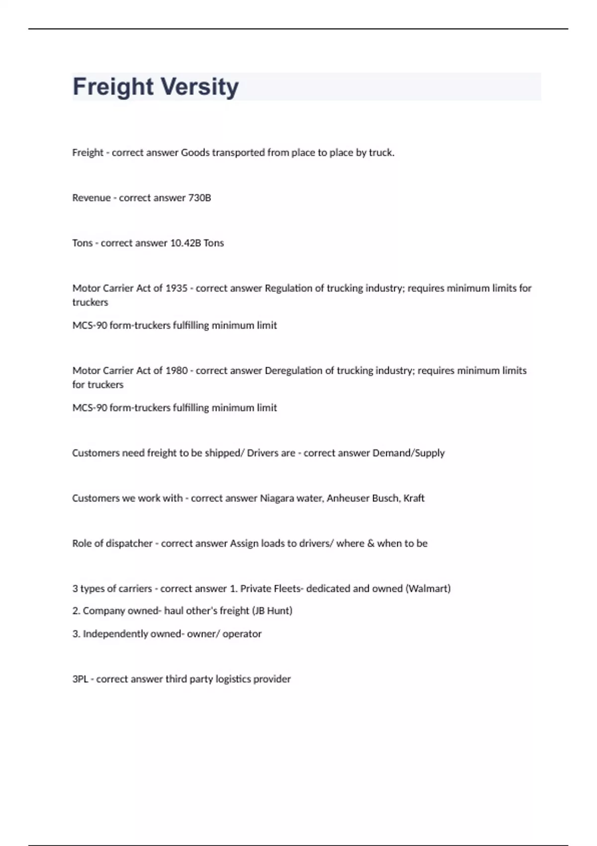 Freight VersityFreight - correct answer Goods transported from place to place by truck. Revenue - correct answer 730B Tons - correct answer 10.42B Tons Motor Carrier Act of 1935 - correct answer Regulation of trucking industry; requires minimum limits for truckers MCS-90 form-truckers fulfilling minimum limit Motor Carrier Act of 1980 - correct answer Deregulation of trucking industry; requires minimum limits for truckers MCS-90 form-truckers fulfilling minimum limit Customers need freight to be shipped/ Drivers are - correct answer Demand/Supply Customers we work with - correct answer Niagara water, Anheuser Busch, Kraft Role of dispatcher - correct answer Assign loads to drivers/ where & when to be 3 types of carriers - correct answer 1. Private Fleets- dedicated and owned (Walmart) 2. Company owned- haul other's freight (JB Hunt) 3. Independently owned- owner/ operator 3PL - correct answer third party logistics provider