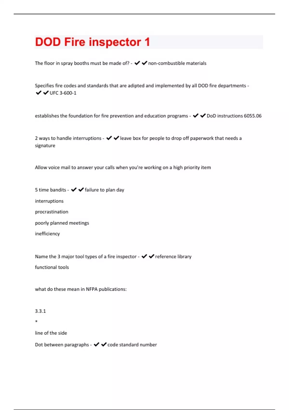 The floor in spray booths must be made of? - non-combustible materials Specifies fire codes and standards that are adipted and implemented by all DOD fire departments - UFC 3-600-1 establishes the foundation for fire prevention and education programs - DoD instructions 6055.06 2 ways to handle interruptions - leave box for people to drop off paperwork that needs a signature Allow voice mail to answer your calls when you're working on a high priority item 5 time bandits - failure to plan day interruptions procrastination poorly planned meetings inefficiency Name the 3 major tool types of a fire inspector - reference library functional tools what do these mean in NFPA publications: 3.3.1 * line of the side Dot between paragraphs - code standard number* explanatory material in appendix line- new changes dot - paragraph deleted provides minimum requirements to ensure a reasonable degree of safety to life form fire in building and structures. - NFPA 101 life safety handbook color-coded description of fire alarm systems and it includes recommendations for efficient compliance with the requirements of NFPA 72 - national fire alarm and signaling code handbook describes proper electrical systems and equipment installation for compliance with NFPA 70 national electrical code - national electric code handbook provides a comprehensive description of fire safety and systems. - fire protection handbook