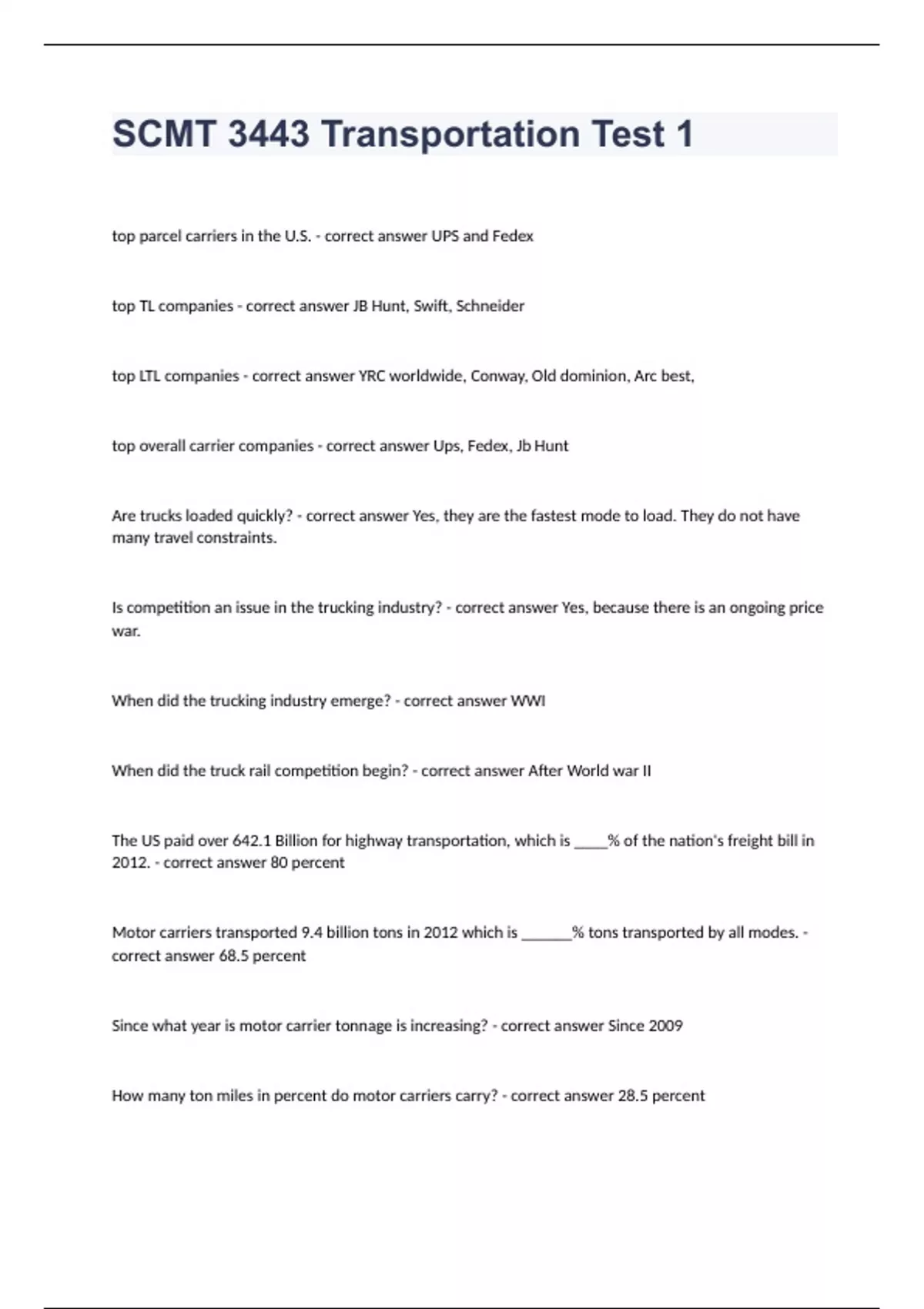 SCMT 3443 Transportation Test 1top parcel carriers in the U.S. - correct answer UPS and Fedex top TL companies - correct answer JB Hunt, Swift, Schneider top LTL companies - correct answer YRC worldwide, Conway, Old dominion, Arc best, top overall carrier companies - correct answer Ups, Fedex, Jb Hunt Are trucks loaded quickly? - correct answer Yes, they are the fastest mode to load. They do not have many travel constraints. Is competition an issue in the trucking industry? - correct answer Yes, because there is an ongoing price war. When did the trucking industry emerge? - correct answer WWI When did the truck rail competition begin? - correct answer After World war II The US paid over 642.1 Billion for highway transportation, which is ____% of the nation's freight bill in 2012. - correct answer 80 percent Motor carriers transported 9.4 billion tons in 2012 which is ______% tons transported by all modes. - correct answer 68.5 percent Since what year is motor carrier tonnage is increasing? - correct answer Since 2009 How many ton miles in percent do motor carriers carry? - correct answer 28.5 percent *How many people were employed in the motor carrier industry in 2011? * - correct answer 6.9 Million People When did the industry revenue top out? - correct answer 2008 * On average how many miles did motor carriers travel for business purposes in 2010?* - correct answer 397.8 Billion What percentage of communities do trucking industry serve? - correct answer 80 percent of all communitites for hire carriers - correct answer Provide service to the public and then charge a fee (ex. Jb Hunt) (more than 212,000) What are the different type of carrier classifications? - correct answer For hire carriers, private carriers, local private carriers - correct answer Provide the service to the company that owns the vehicle, (Ex. Nestle) -They don't charge you every time they move something, but there is a charge -Can sometimes be hired and it is exempt for hire (More than 277,000) local carriers - correct answer They only go to within the city intercity - correct answer Driving between cities common operators - correct answer They serve the general public (ex. JB Hunt) What is a contract operator? - correct answer They serve specific shippers who they have a contract with