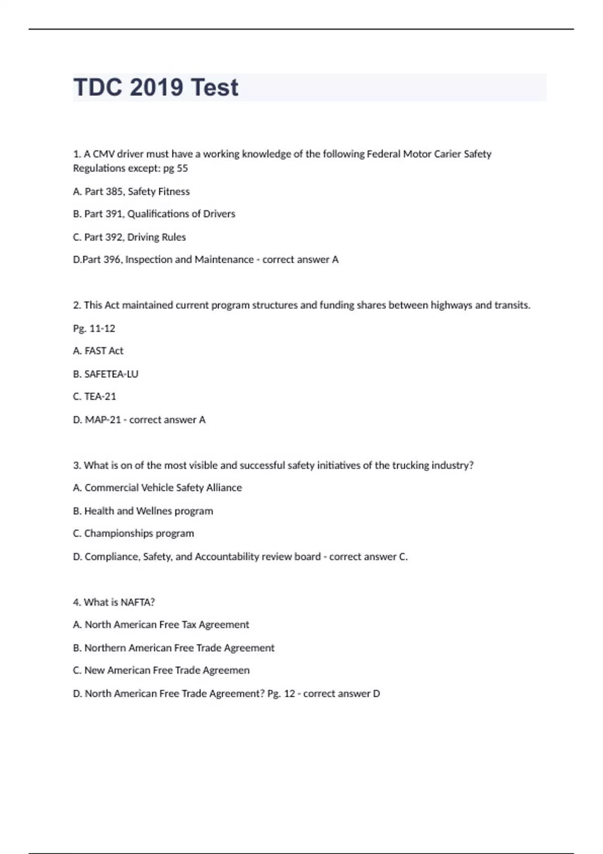 TDC 2019 Test1. A CMV driver must have a working knowledge of the following Federal Motor Carier Safety Regulations except: pg 55 A. Part 385, Safety Fitness B. Part 391, Qualifications of Drivers C. Part 392, Driving Rules D.Part 396, Inspection and Maintenance - correct answer A 2. This Act maintained current program structures and funding shares between highways and transits. Pg. 11-12 A. FAST Act B. SAFETEA-LU C. TEA-21 D. MAP-21 - correct answer A 3. What is on of the most visible and successful safety initiatives of the trucking industry? A. Commercial Vehicle Safety Alliance B. Health and Wellnes program C. Championships program D. Compliance, Safety, and Accountability review board - correct answer C. 4. What is NAFTA? A. North American Free Tax Agreement B. Northern American Free Trade Agreement C. New American Free Trade Agreemen D. North American Free Trade Agreement? Pg. 12 - correct answer D