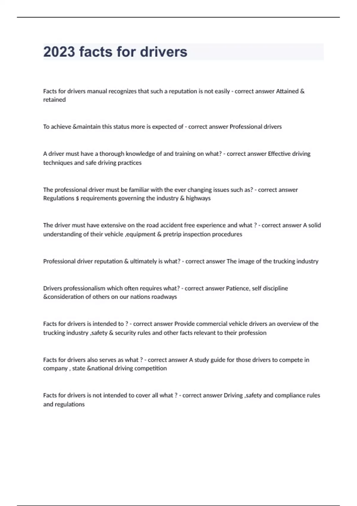 2023 facts for driversFacts for drivers manual recognizes that such a reputation is not easily - correct answer Attained & retained To achieve &maintain this status more is expected of - correct answer Professional drivers A driver must have a thorough knowledge of and training on what? - correct answer Effective driving techniques and safe driving practices The professional driver must be familiar with the ever changing issues such as? - correct answer Regulations $ requirements governing the industry & highways The driver must have extensive on the road accident free experience and what ? - correct answer A solid understanding of their vehicle ,equipment & pretrip inspection procedures Professional driver reputation & ultimately is what? - correct answer The image of the trucking industry Drivers professionalism which often requires what? - correct answer Patience, self discipline &consideration of others on our nations roadways Facts for drivers is intended to ? - correct answer Provide commercial vehicle drivers an overview of the trucking industry ,safety & security rules and other facts relevant to their profession Facts for drivers also serves as what ? - correct answer A study guide for those drivers to compete in company , state &national driving competition