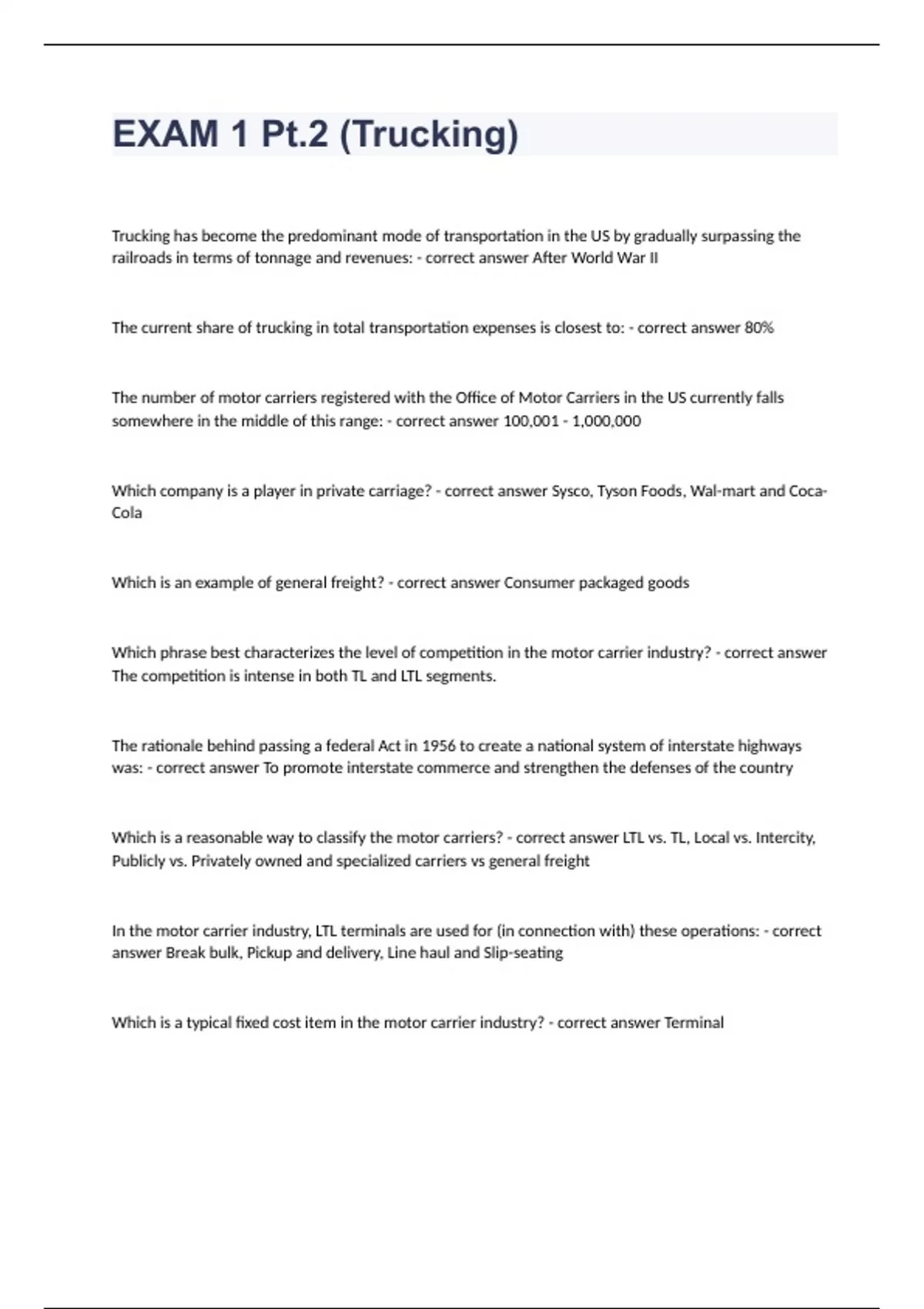 EXAM 1 Pt.2 (Trucking)Trucking has become the predominant mode of transportation in the US by gradually surpassing the railroads in terms of tonnage and revenues: - correct answer After World War II The current share of trucking in total transportation expenses is closest to: - correct answer 80% The number of motor carriers registered with the Office of Motor Carriers in the US currently falls somewhere in the middle of this range: - correct answer 100,001 - 1,000,000 Which company is a player in private carriage? - correct answer Sysco, Tyson Foods, Wal-mart and Coca-Cola Which is an example of general freight? - correct answer Consumer packaged goods Which phrase best characterizes the level of competition in the motor carrier industry? - correct answer The competition is intense in both TL and LTL segments. The rationale behind passing a federal Act in 1956 to create a national system of interstate highways was: - correct answer To promote interstate commerce and strengthen the defenses of the country Which is a reasonable way to classify the motor carriers? - correct answer LTL vs. TL, Local vs. Intercity, Publicly vs. Privately owned and specialized carriers vs general freight In the motor carrier industry, LTL terminals are used for (in connection with) these operations: - correct answer Break bulk, Pickup and delivery, Line haul and Slip-seating Which is a typical fixed cost item in the motor carrier industry? - correct answer Terminal