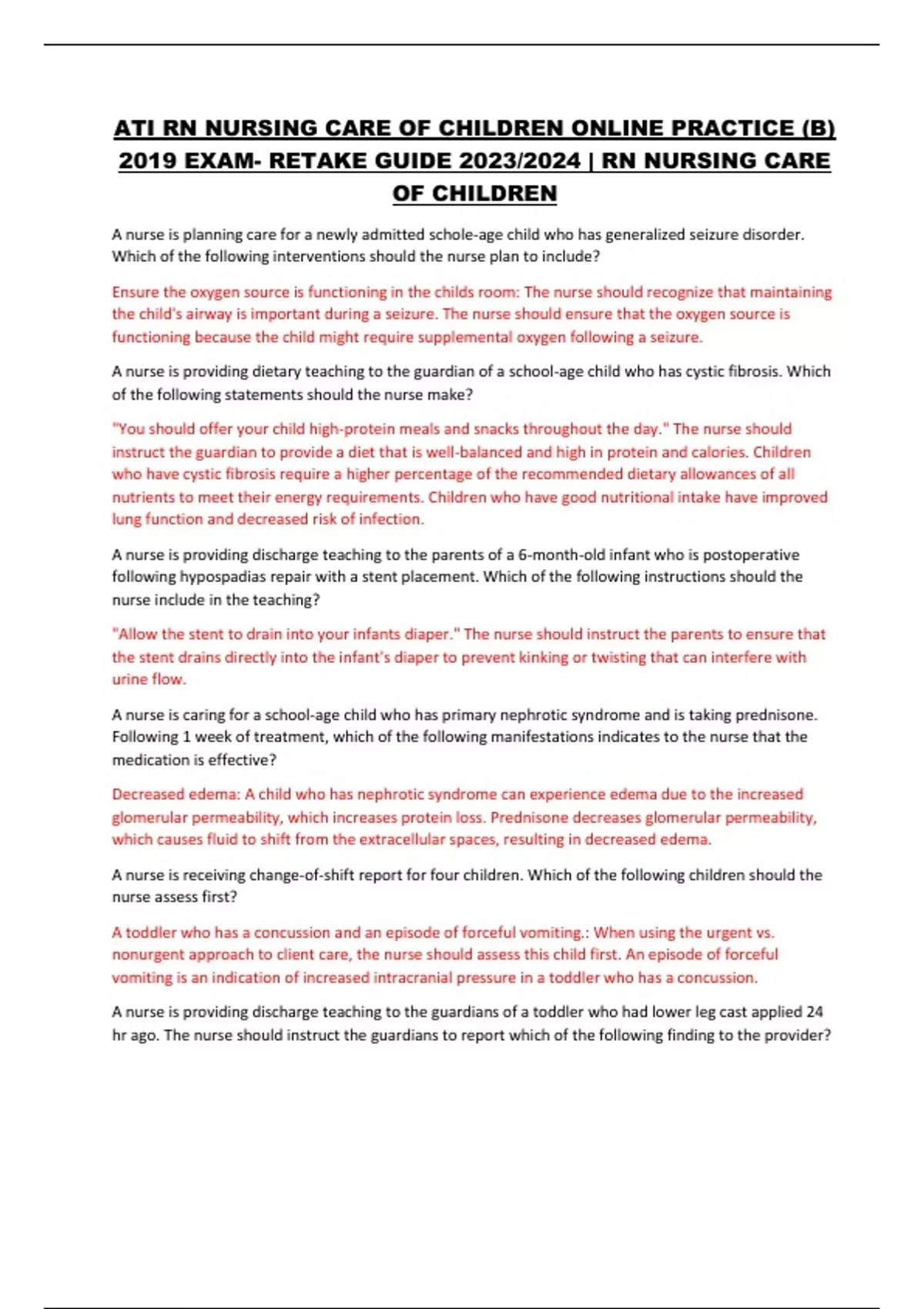 ATI RN NURSING CARE OF CHILDREN ONLINE PRACTICE (B) 2019 EXAM- RETAKE GUIDE 2023/2024 | RN NURSING CARE OF CHILDREN