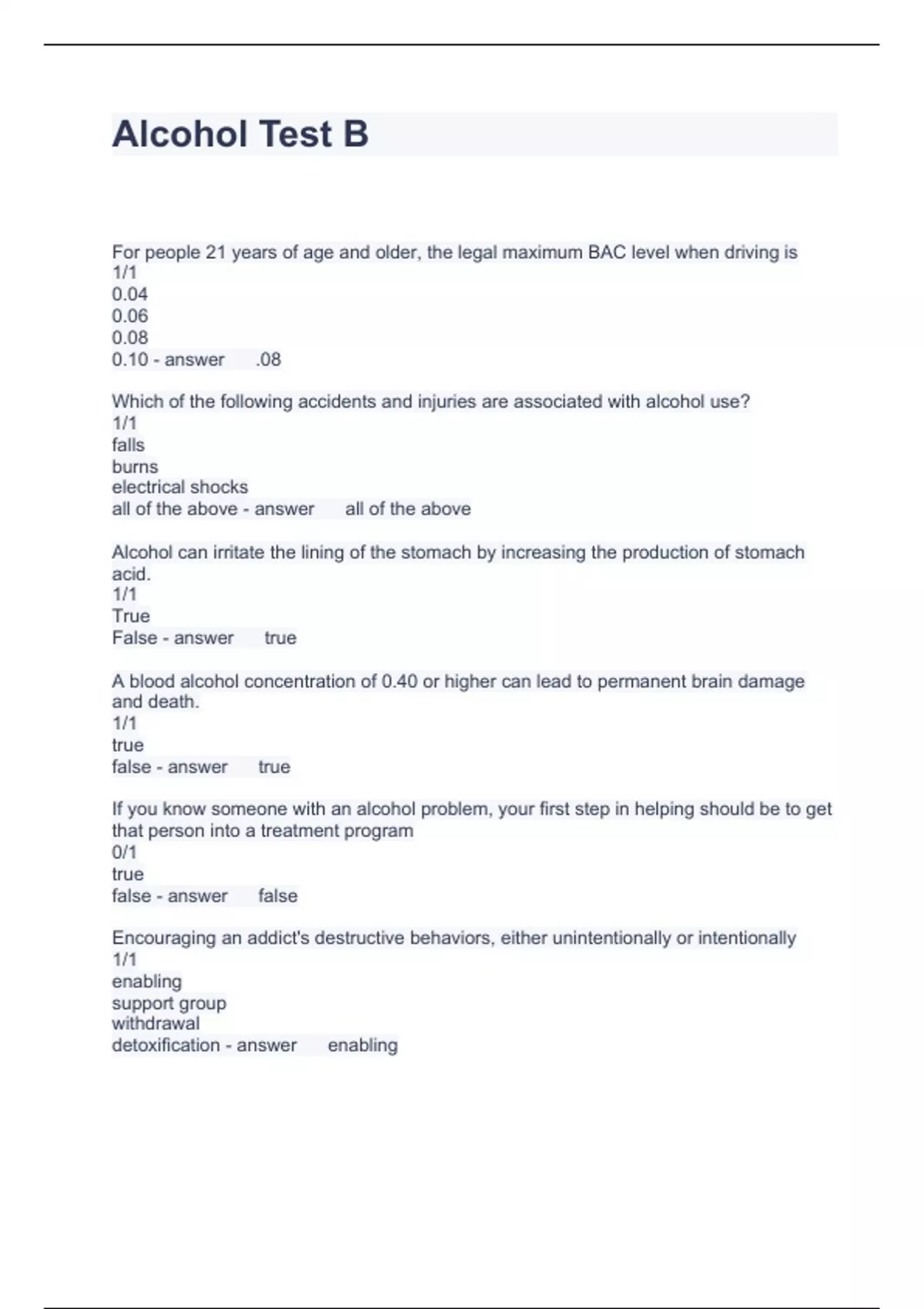 Alcohol Test B Questions and Answers 2023
