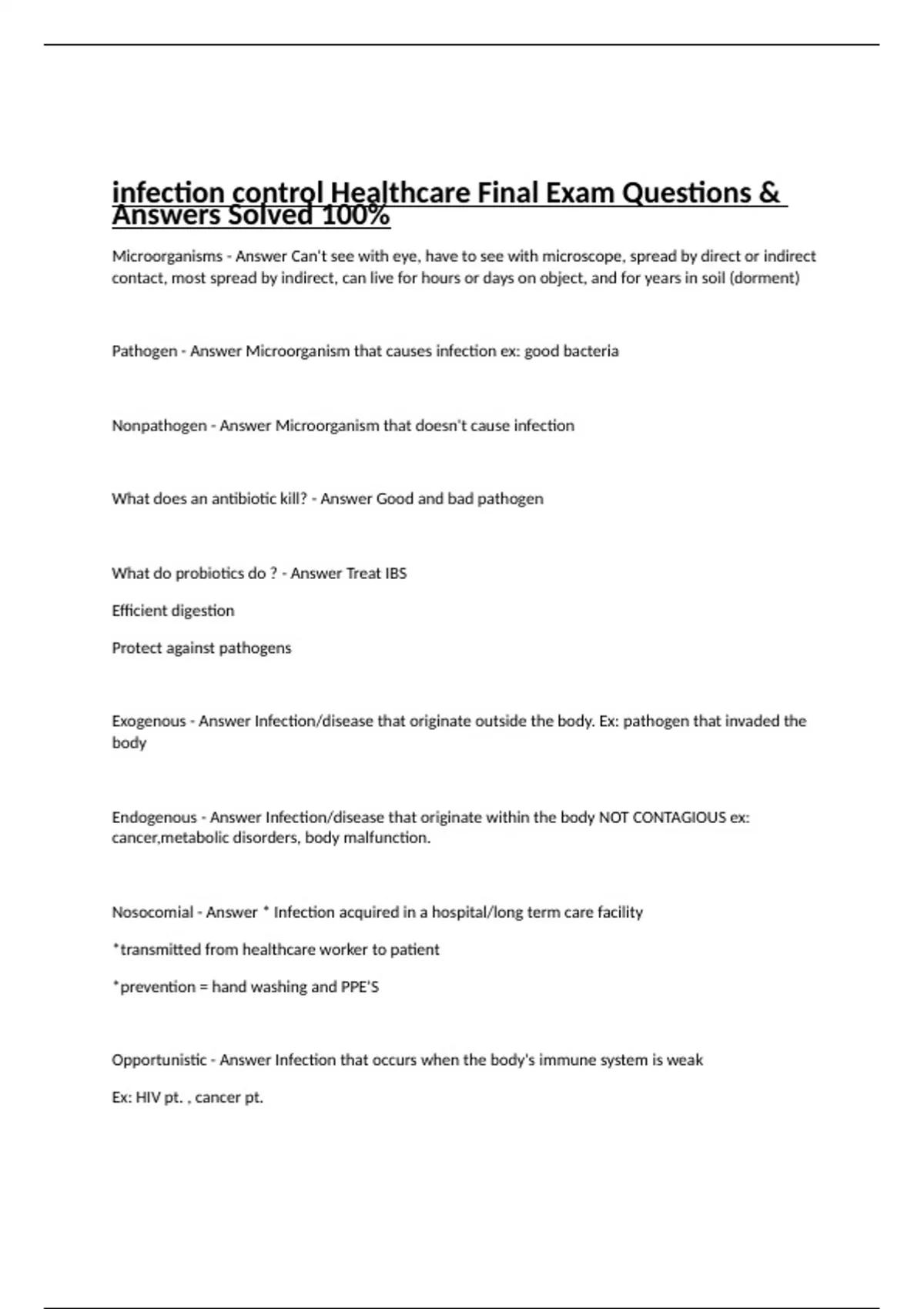 infection control Healthcare Final Exam Questions & Answers Solved 100%